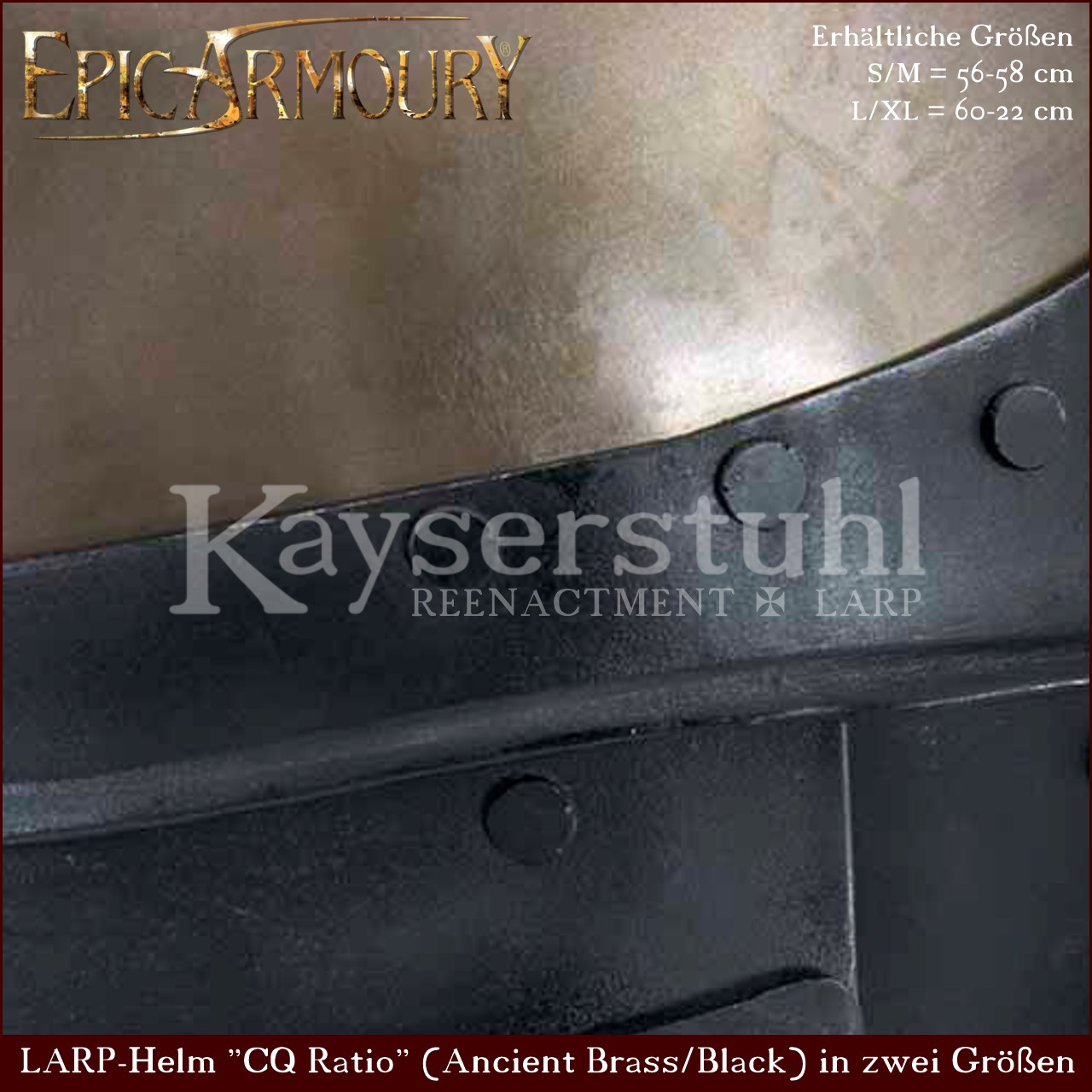 Der CQ-Ratio-Helm kann mit anderen Plattenteilen von Epic Armoury kombiniert werden, was dir die Freiheit gibt, das Kostüm deines Charakters individuell zu gestalten. Riemen und Beschläge bestehen aus hochwertigem Leder. Der Helm hat selbstverständlich einen Kinnriemen aus Leder mit passender Schnalle. LARP-typisch sind diese Helme mit 1 mm Materialstärke deutlich leichter als die schaukampftauglichen Reenactment-Helme die wir sonst anbieten. Damit halten sie aber den geschäumten Waffen durchaus Stand. Auch für Bühnen- und TV-Produktionen sind diese Helme durchaus interessant. Im Gegensatz zu anderen Helmen und Rüstungssets von Epic Armoury die in der Regel in "Epic Dark" (geschwärzt) und "Matte Polish" (poliert) erhältlich sind, gibt es hier eine geschwärzte Variante im Mix mit einem eleganten Altmessing-Finish.