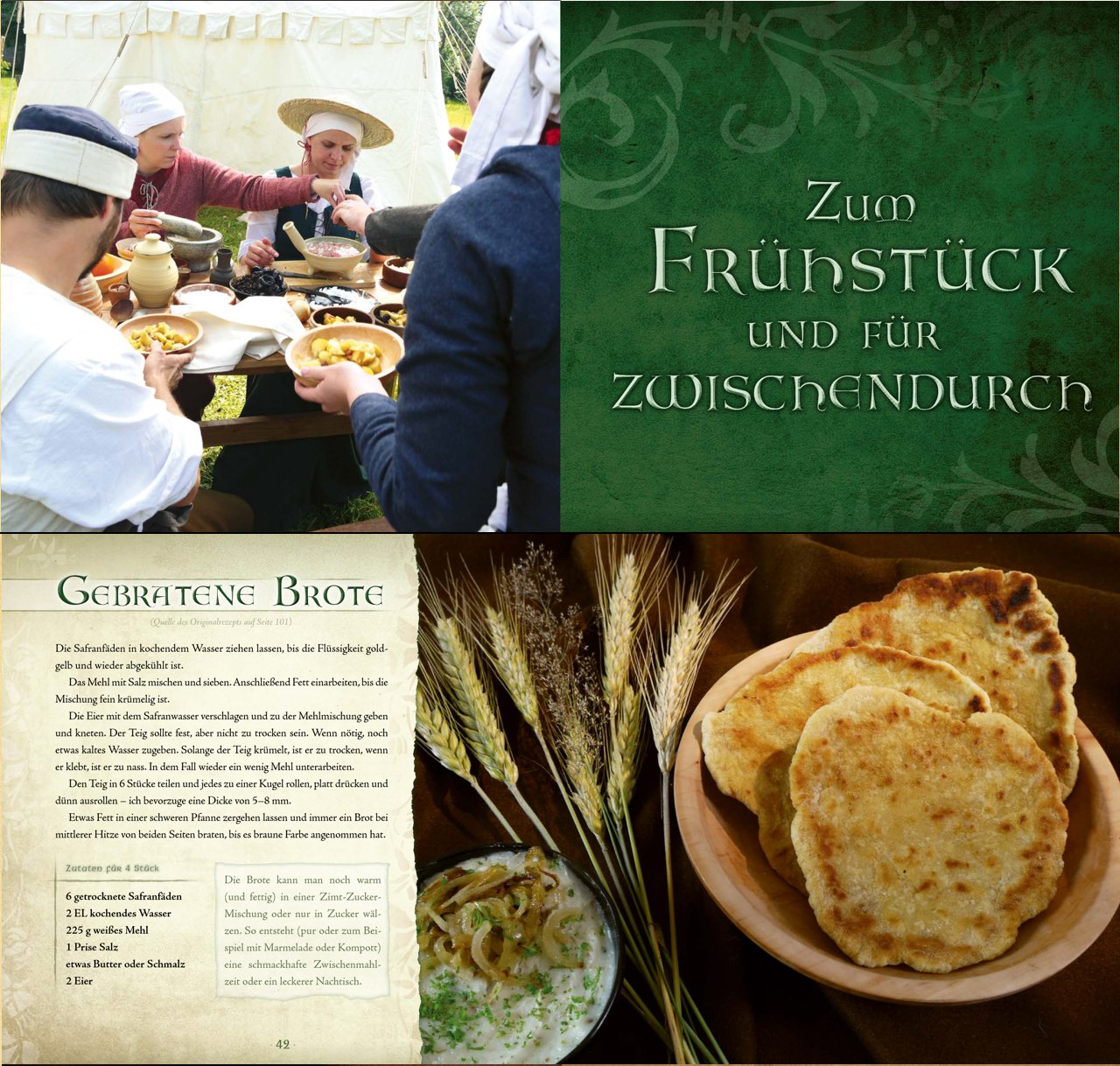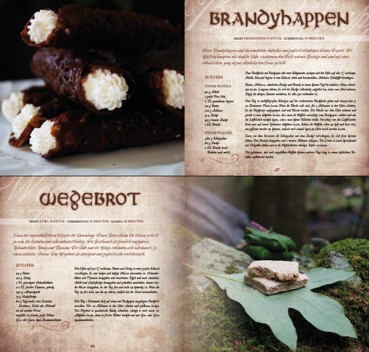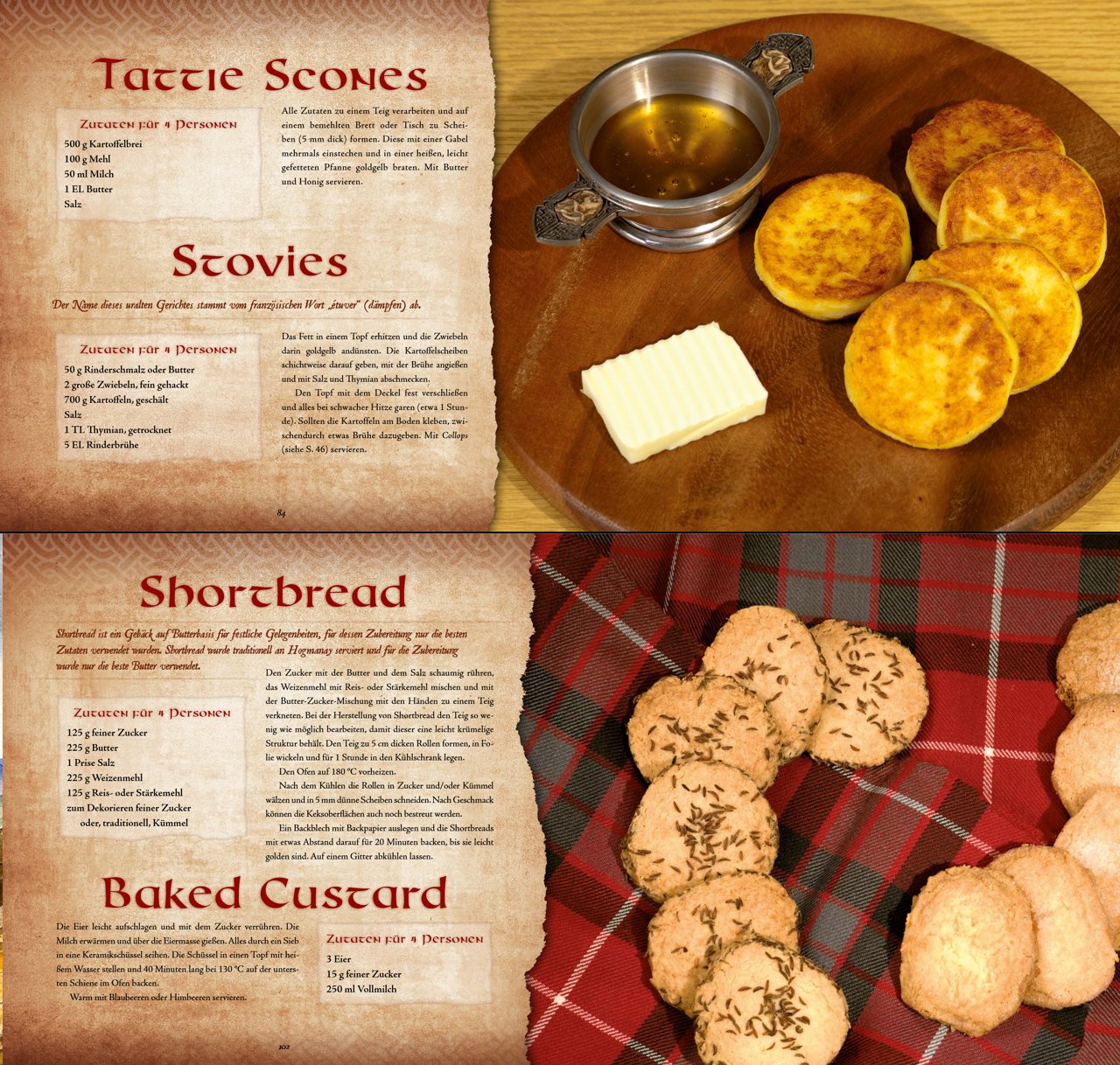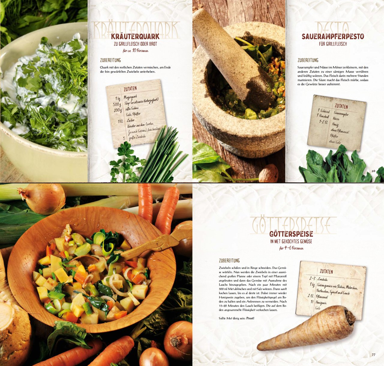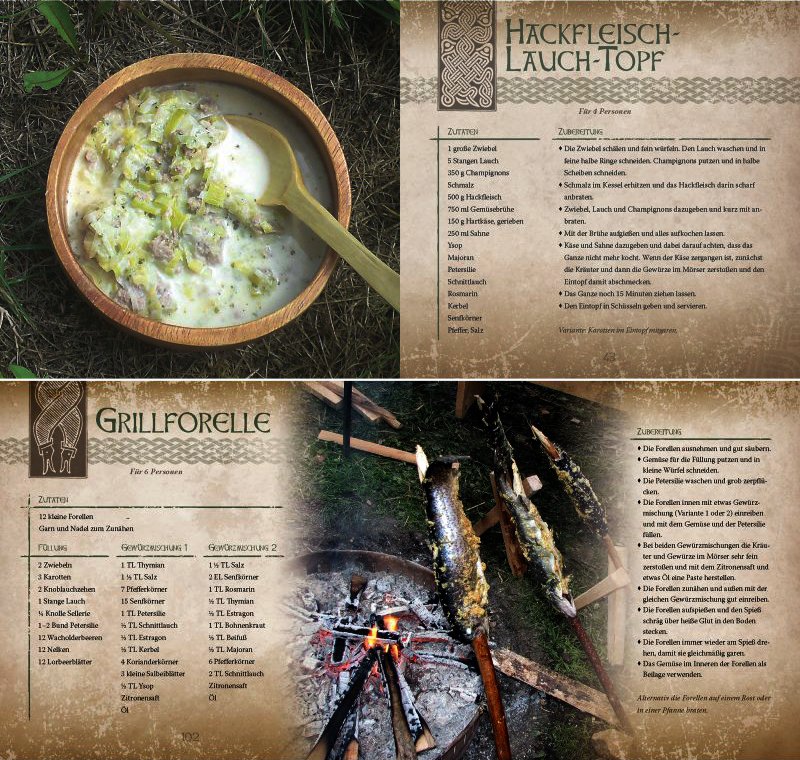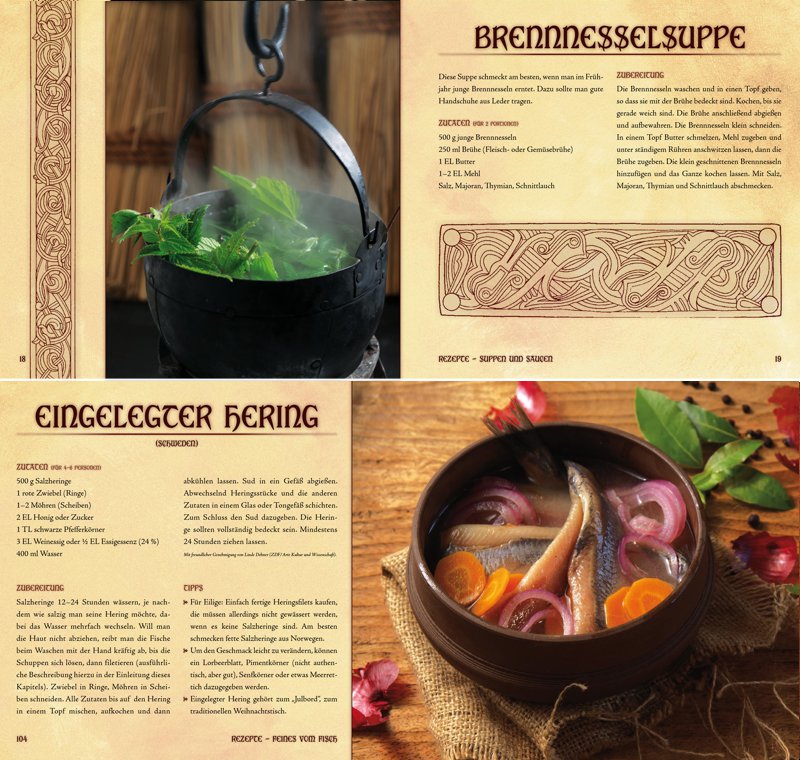 Das Kelten-Kochbuch zeigt sich im prachtvollen Gewand. Es erscheint als edles Hardcover im quadratischen Format und enthält professionelle Fotografien zu einem Großteil der Rezepte. Alle 136 Seiten sind vollfarbig und thematisch passend gestaltet, damit bereits beim Blättern der Funke des keltischen Lebensgefühls überspringt.