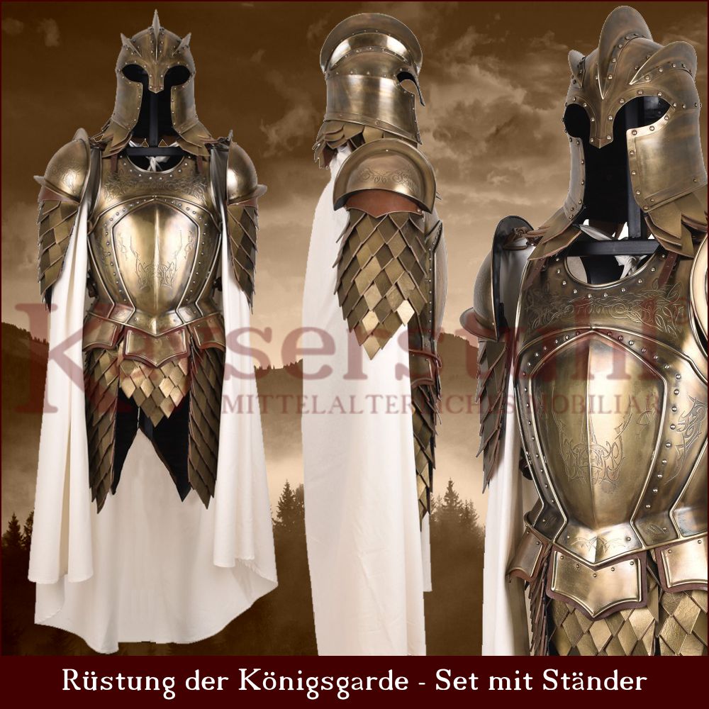 Äusserst beeindruckende und aufwändig verzierte Rüstung aus ca. 1,2 mm Stahl mit Antik-Finish in Messing-Optik handgefertigt. Nacken, Oberarme und Oberschenkel ziert ein goldener Schuppenpanzer aus einander überlappenden Kernleder-Lamellen. Die Rüstung ist über Lederriemen mit Schnallen einstellbar.