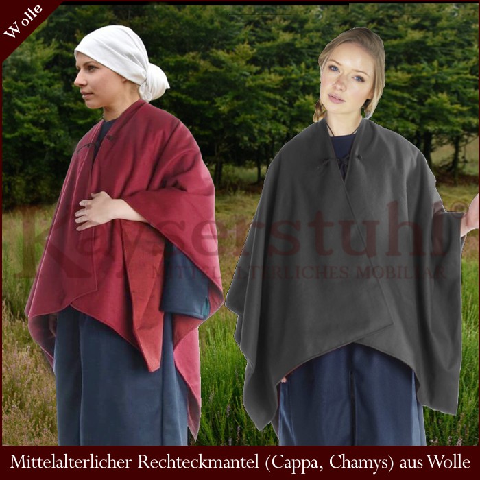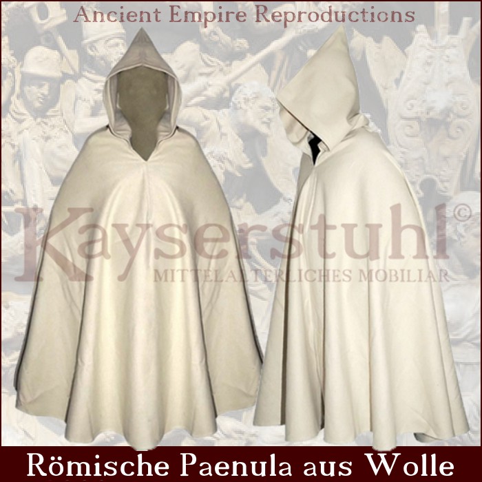 Die Paenula ist ein seit dem 4. Jahrhundert v. Chr. belegter römischer Überziehmantel. Seine Grundform war ein Oval, das in der Mitte einen Kopfschlitz und eine Kapuze hatte. Anfangs wurde die Paenula vor allem als Mantel der unteren Stände getragen, um die Zeitenwende auch in der Oberschicht für Frauen und Männer. Unsere hier ist aus naturfarbener Wolle.