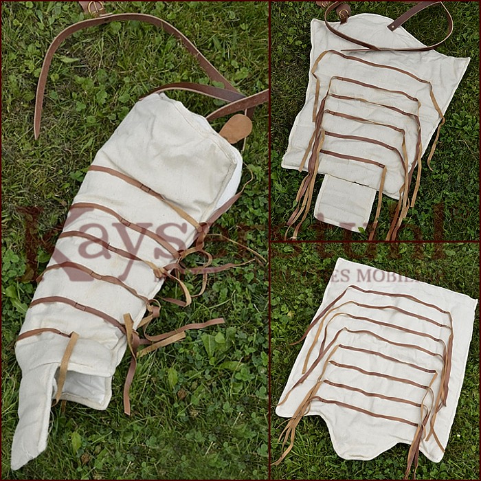 Das Obermaterial besteht aus Segeltuch aus Baumwolle, dann kommt eine weiche Polsterfüllung aus Polyester und ein Innenfutter aus Baumwolle. Beim Armschutz ist im Schulterbereich ein fester Lederriemen angenietet. Sechs Lederbänder ermöglichen eine hervorragende und individuelle Befestigung am Arm. Beim Beinschutz sind es jeweils acht Lederbänder.