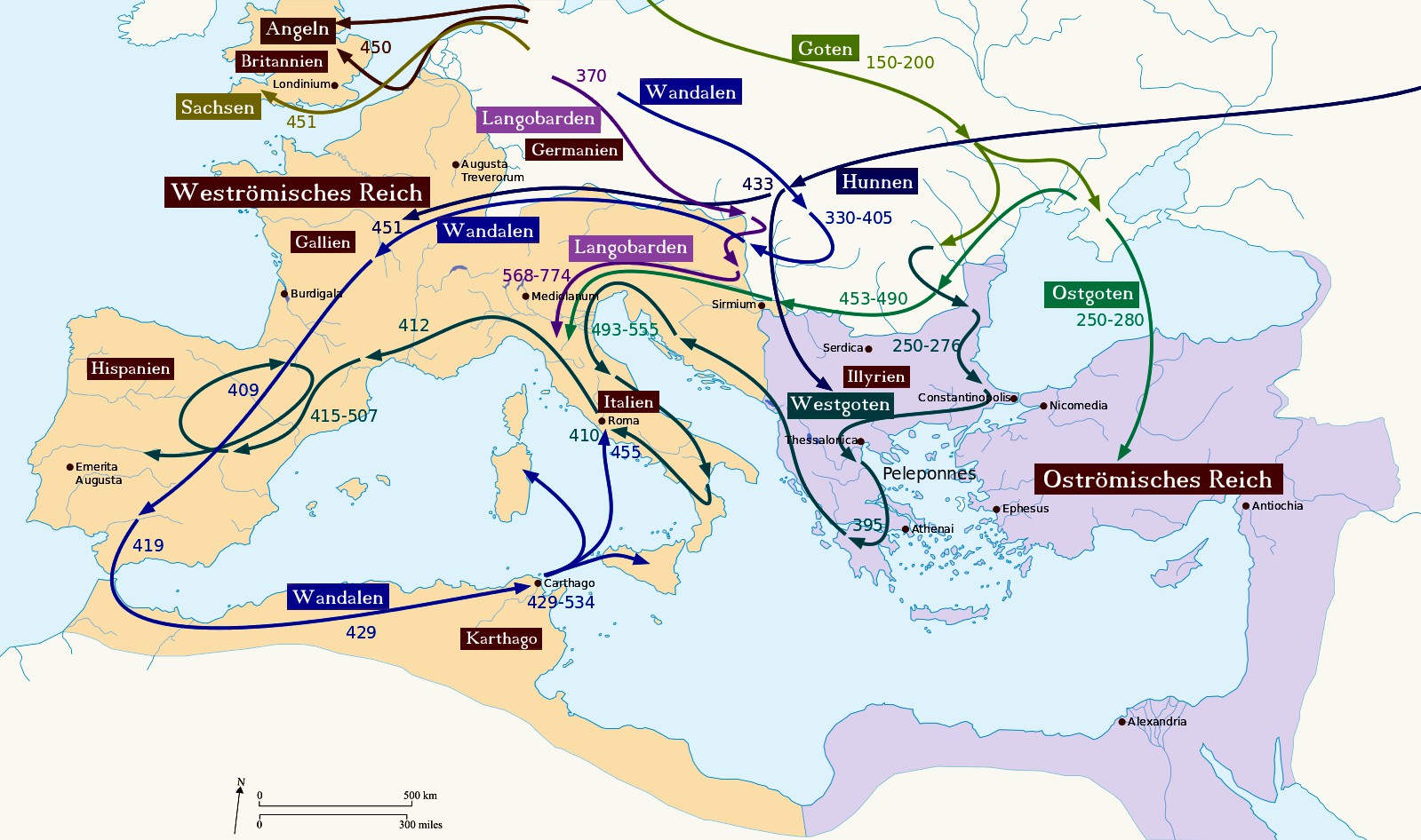 Als Völkerwanderung wird die Wanderung vor allem germanischer Gruppen in Mittel- und Südeuropa im Zeitraum vom Einbruch der Hunnen nach Europa ca. 375/376 bis zum Einfall der Langobarden in Italien 568 bezeichnet. Die Völkerwanderungszeit bildet für West- und Mitteleuropa sowie den nördlichen Mittelmeerraum ein Bindeglied zwischen klassischer Antike und dem Frühmittelalter.