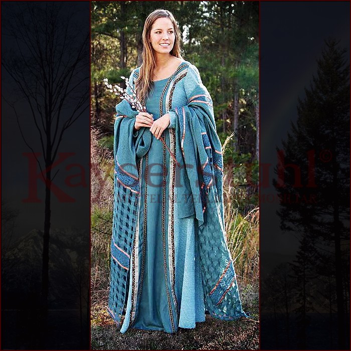 Trotz leuchtender Farben ist dieses Kleid mit Überwurf natürlich und erdverbunden, was sicher auch an der rustikalen Webart des Baumwollstoffes liegt. Mal abgesehen davon, dass blaue Kleider mit der Entwicklung neuer Stofffärbetechniken überhaupt erst im 13. Jahrhundert verfügbar waren, vermittelt diese Gewandung einen normannischen Eindruck, lässt eine exakte zeitliche Datierung allerdings offen. Das bodenlange Kleid ist mit einem Patchwork verschiedener Stoffstrukturen versehen, die mit schmuckvollen Borten abgesetzt sind. Diese Muster finden sich auch in dem zugehörigen, gewebten Überwurf, der sich lässig über Kopf oder Schultern drapieren lässt.