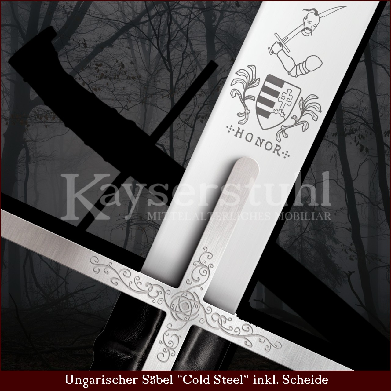 Für ihre eigene Version ließ sich die Firma Cold Steel® von antiken Stücken aus privaten Sammlungen inspirieren. Die Klinge aus Karbonstahl 1055 ist auf Federhärte angelassen und würde den britischen Proof Test (Schwerttest) bestehen. Dieser wunderschöne Säbel kommt mit einer Stahlscheide mit zwei Tragringen und kann somit einfach am Sattel oder Gürtel befestigt werden.