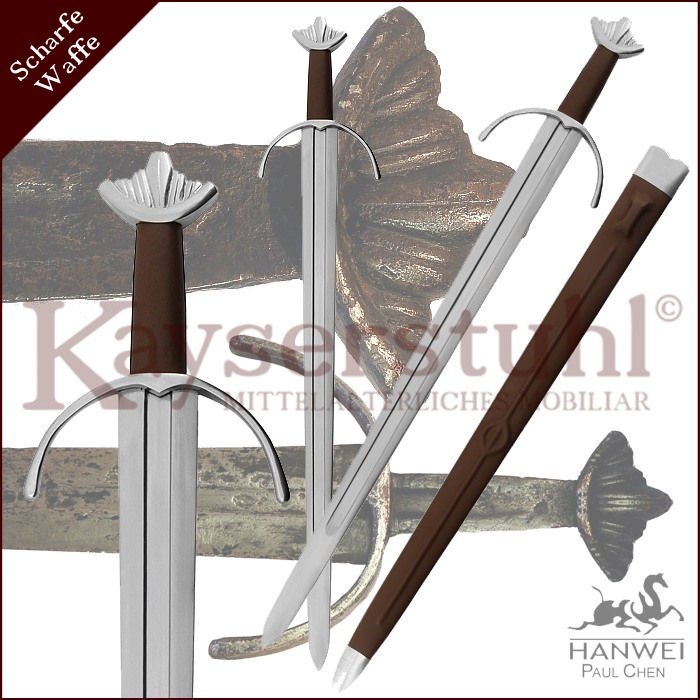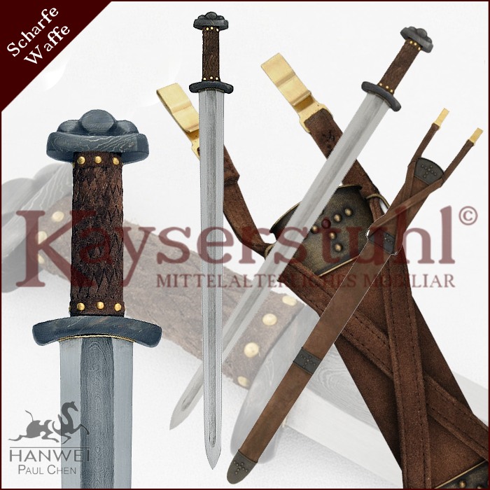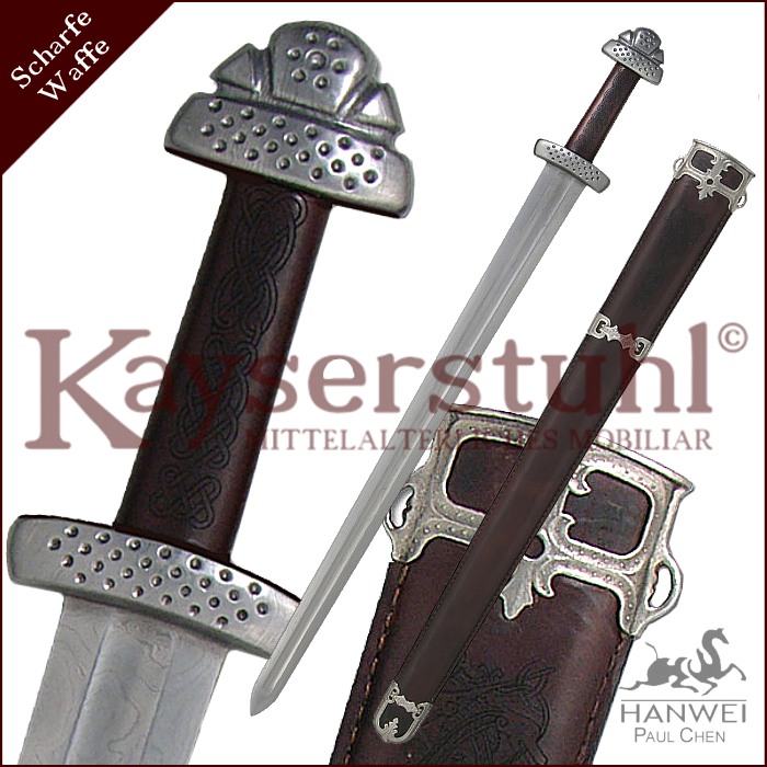 Schlamm des Ouse-River konserviert war, ziert es heute als eine der Hauptattraktionen das Yorkshire Museum. In Norwegen wurde im Jahr 1888 übrigens ein Schwert entdeckt, das höchstwahrscheinlich ein Schwester-schwert des "Cawood" ist und deshalb wertvolle Hinweise auf dessen Ursprung gibt. Hanweis Version dieses legendären Schwertes gibt beinahe perfekt den gelappten Knauf und die abwärts geschwungene Parierstange wieder. Die mit einer breiten Hohlkehle ausgestattete Klinge wird aus hochwertigem 5160er Carbonstahl hergestellt. Ausgewogenes Gewicht und Balance sorgen für ein sehr gut zu handhabendes Schwert. Über die Original-Scheide sind keine Details bekannt, aber diese lederumwickelte Version mit Ort- und Mundblech ist typisch für die Wikingerzeit.