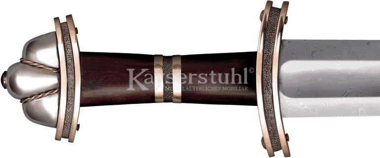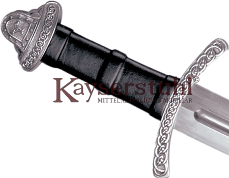 Die Ätzungen auf beiden Seiten der Klinge entsprechen genau dem Original, so dass die Nachbildung fast identisch ist. Das Schwert ist aus Kohlenstoff-Stahl geschmiedet und schön ausbalanciert. Der Griff besteht aus Holz und ist mit einer Lederwicklung ausgestattet. Parierstange und Knauf in Paranuss-Form bestehen ebenfalls aus Stahl. Die Form des Knaufs ist typisch für das 11. Jahrhundert.