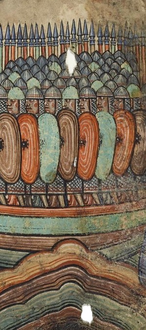 Bild unten: Zwei mit Schwertern bewaffnete Krieger, Detail einer Illustration aus dem Stuttgarter Psalter (fol. 7v), datiert ca. 830 n. Chr.