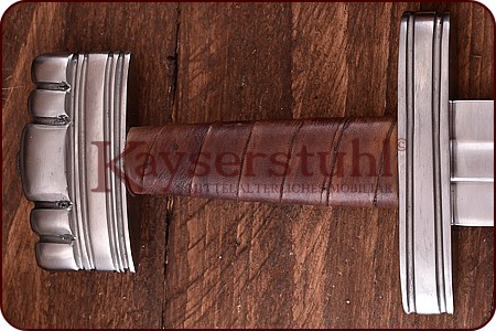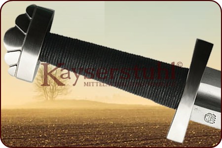 Parierstange und Knauf sind mit einem Rautenmuster verziert. Während dieses beim Originalschwert aus eingearbeiteter Bronze besteht, wird es auf dieser Nachbildung eingeätzt und dann lackiert. Der dreilappige Knauf ist beim Original mit Silberdraht tauschiert, hier ist es Stahldraht. Die geschmiedete Federstahlklinge mit Hohlkehle ist auf 53 HRC gehärtet und somit auch für harten Einsatz geeignet. Knauf und Parierstange sind ebenfalls geschmiedet, genietet und fein verziert. Die Lieferung erfolgt ohne Scheide. Wir fertigen diese optional auf Maß an.