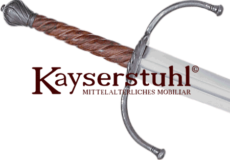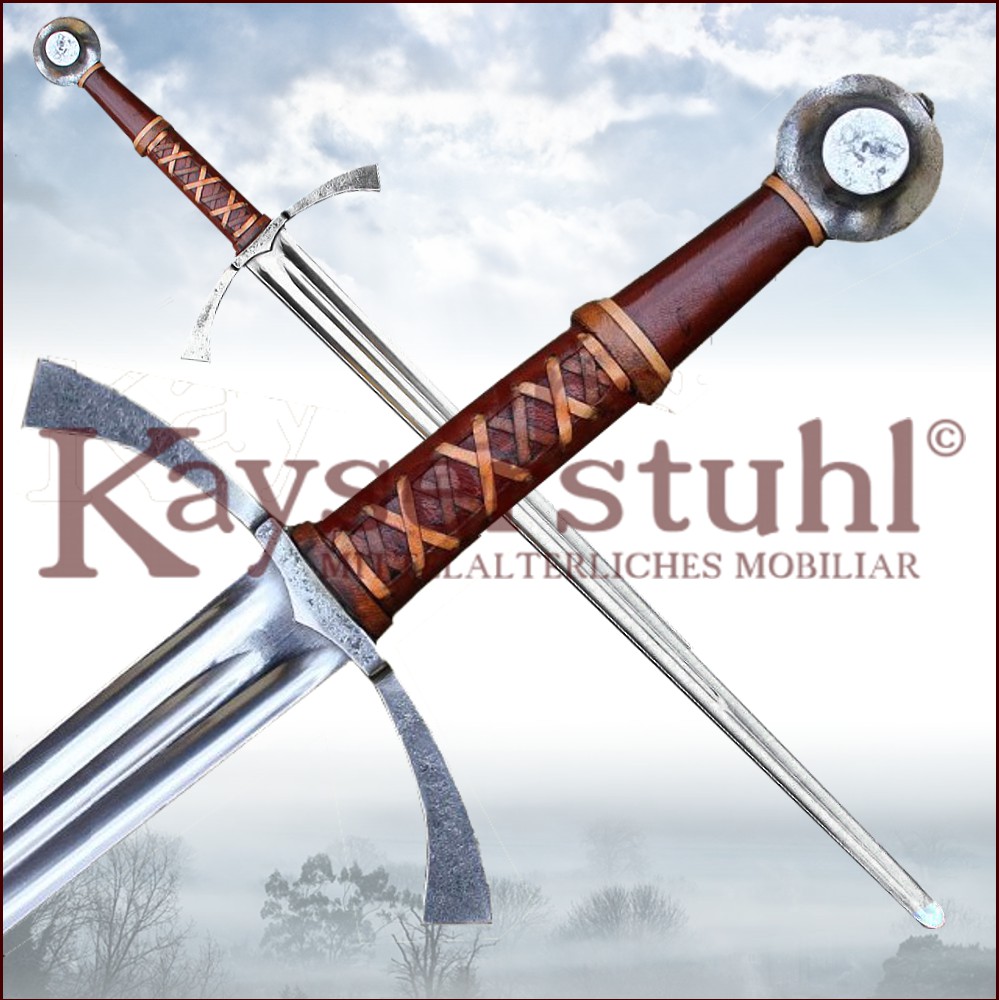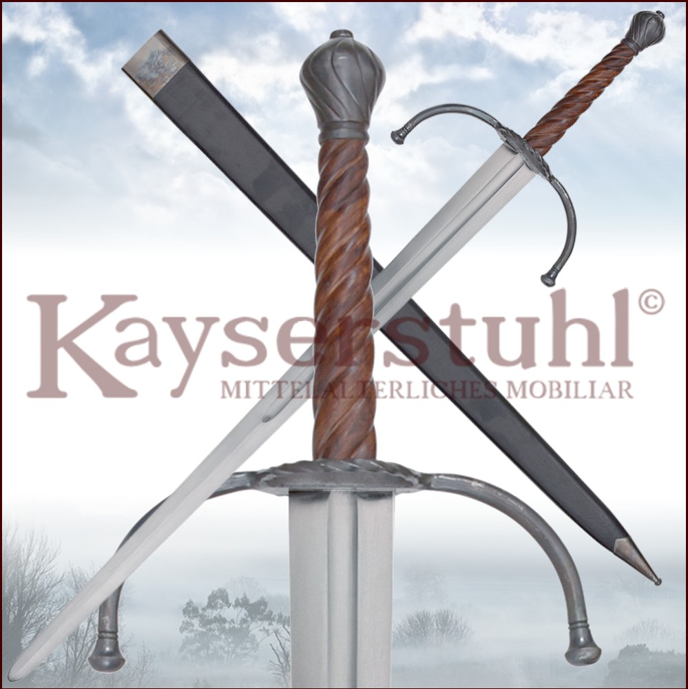 Schöne Rekonstruktion eines spätmittelalterlichen Zweihänders, auch einfach nur "Langes Schwert" genannt. Das Schwert ist in Handarbeit gefertigt. und hat eine auffällige, nach vorne gebogene Parierstange mit tordierten Parieringen. Der Holzgriff ist kunstvoll geschnitzt und weist ebenfalls das Torsionsmuster des Knaufs auf.