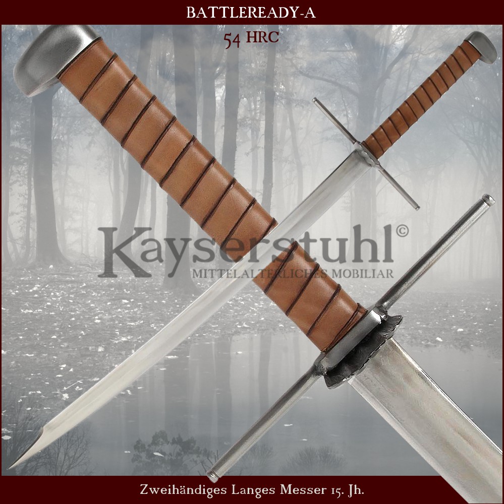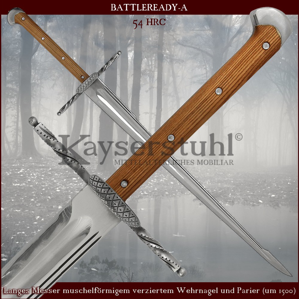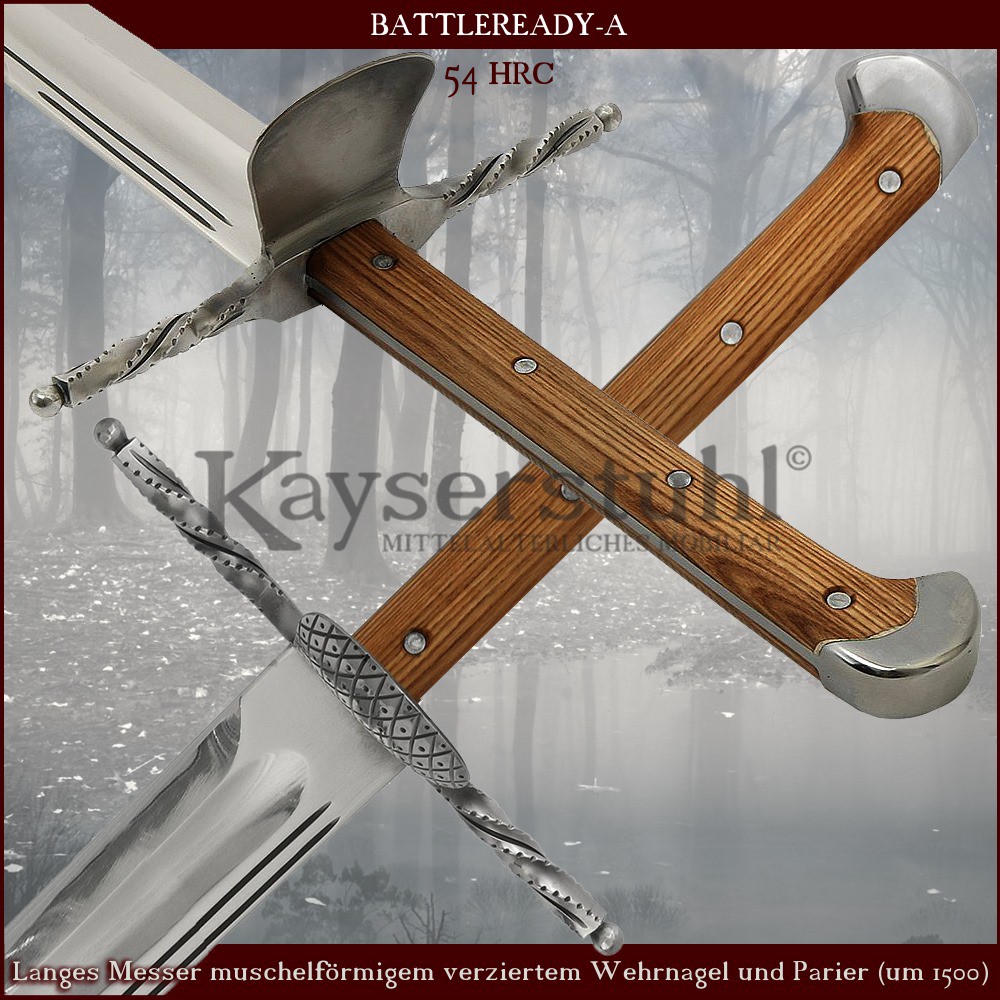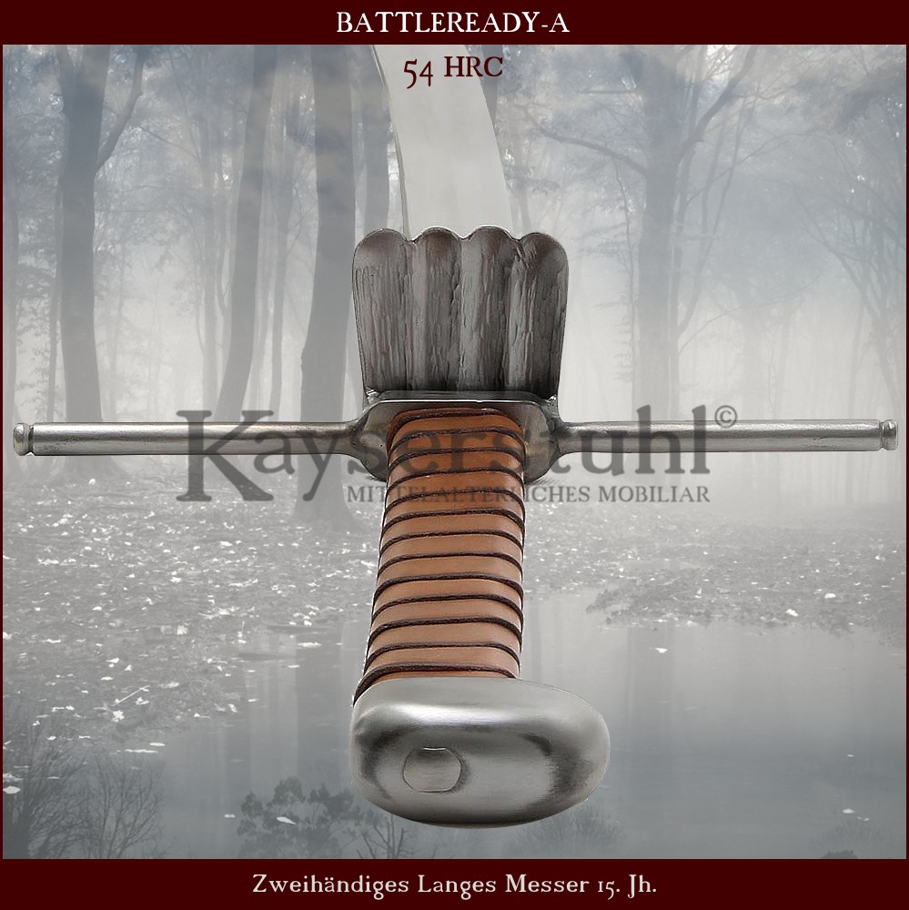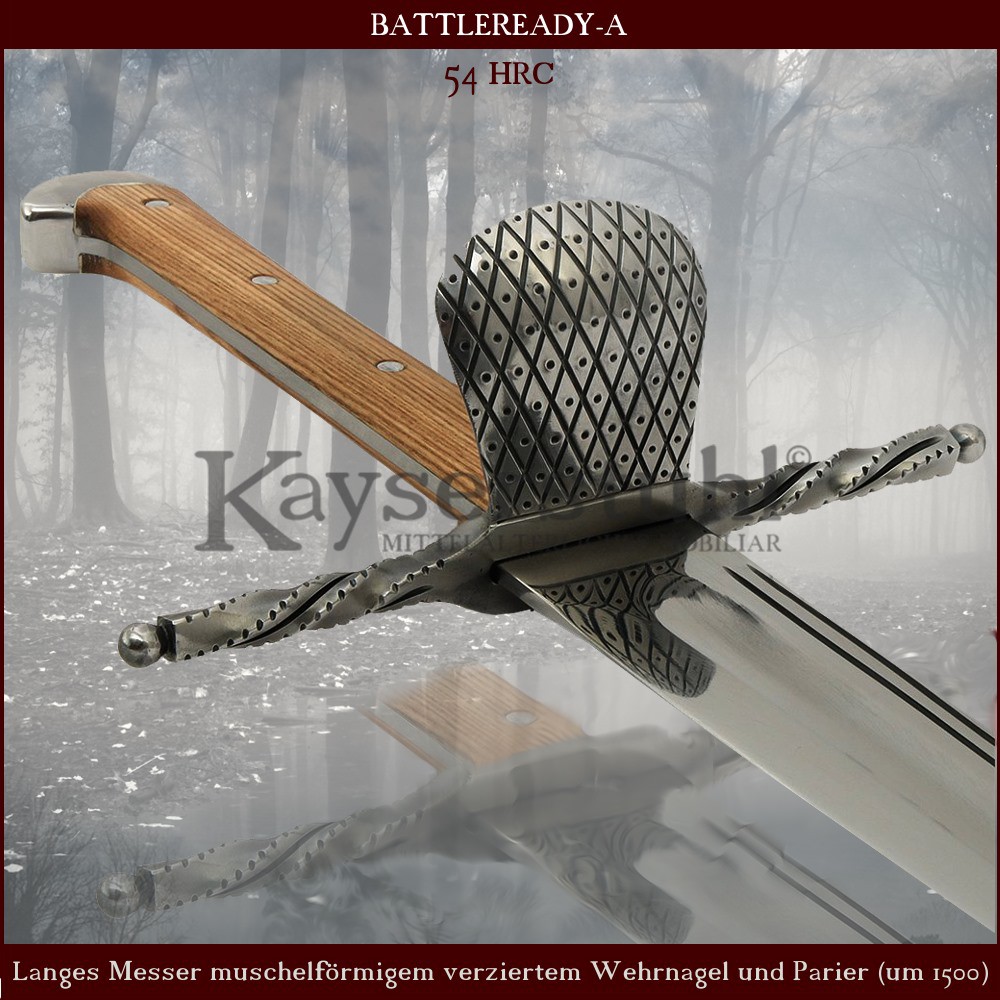 Voll schaukampftaugliche Bidenhänder Variante des Langen Messers aus dem 15. Jahrhundert. Dieses Lange Messer mit einschneidiger Hiebklinge hat eine durchgehender Klingenangel, die mit dem Stahlknauf vernietet ist. Typisch sind bei dieser Blankwaffe die säbelartige Klinge und der muschelförmige Aufsatz auf dem tordierten Parier. Das Parier ist in diesem Fall - wie auch der muschelförmige Wehrnagel -
