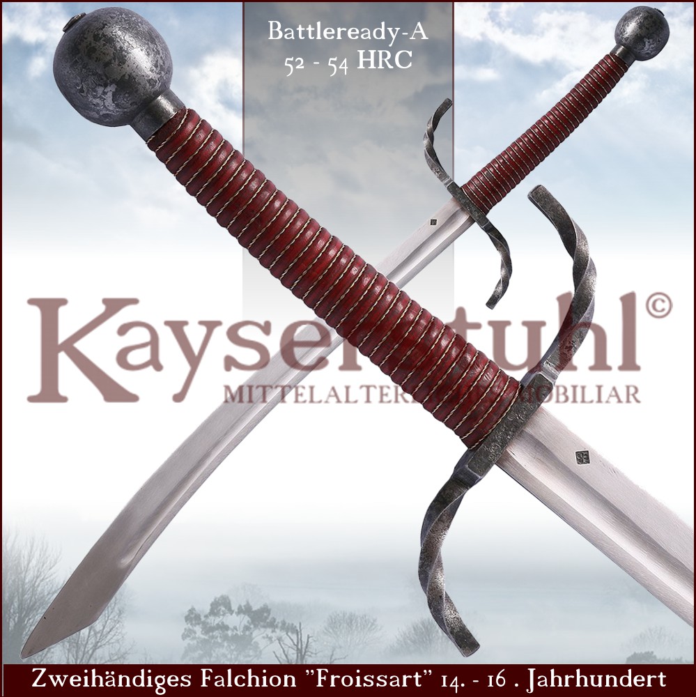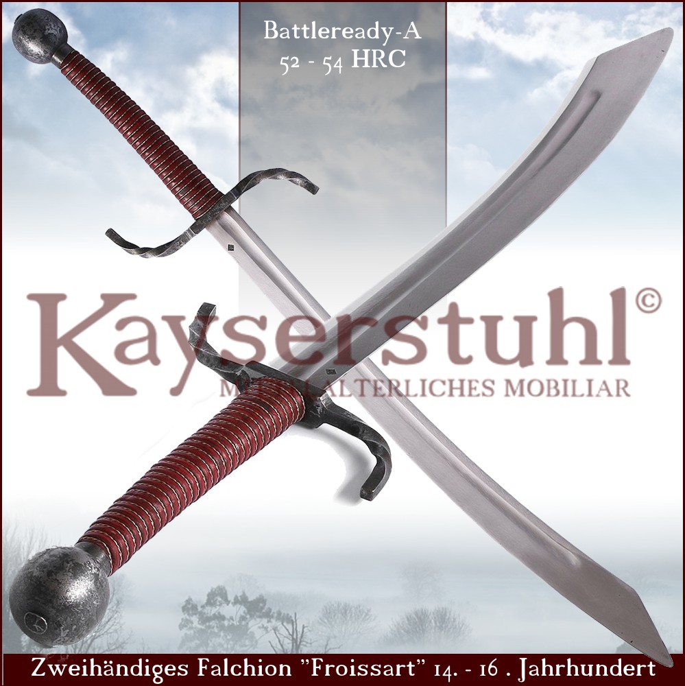 Schaukampftaugliches, komplett handgeschmiedetes Falchion mit sehr gutem Preis-Leistung-Verhältnis. Das Falchion hat eine auf ca. 48-50 HRC ölgehärtete Klinge aus Federstahl 55Si7 (EN45), die bis zum Griff durchgeschmiedet und am Knaufende vernietet ist. Der Holzgriff ist mit Leder umwickelt. Die elegante Parierstange ist ebenfalls handgeschmiedet.