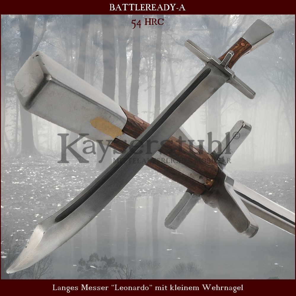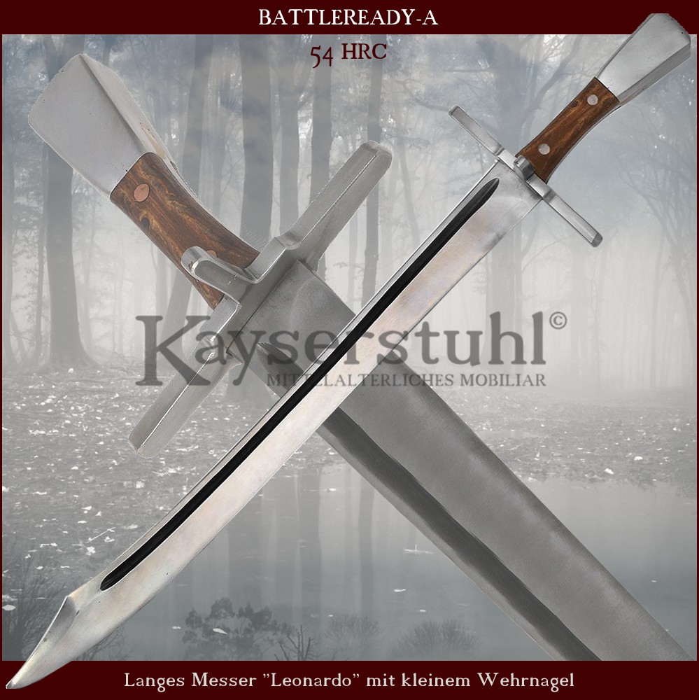 Voll schaukampftaugliche Variante des deutschen Langmessers aus dem 15. Jahrhundert. Dieses Lange Messer hat eine einschneidige Hiebklinge mit durchgehender Klingenangel, die mit dem Stahlknauf hartverlötet ist. Die Griffschalen sind genietet.