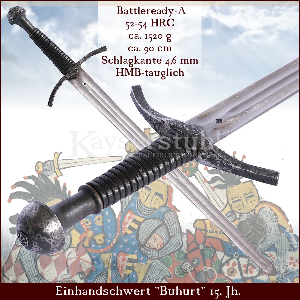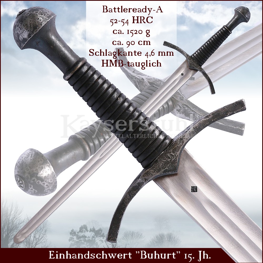 Die hier gezeigten Blankwaffen sind, je nach Typ und Bezeichnung für leichten Schaukampf, Schaukampf, HEMA und/oder Vollkontakt geeignet. Alle Schwerter sind mit "Battleready-A", "Battleready-B" oder "Battleready-C" entsprechend gekennzeichnet.
