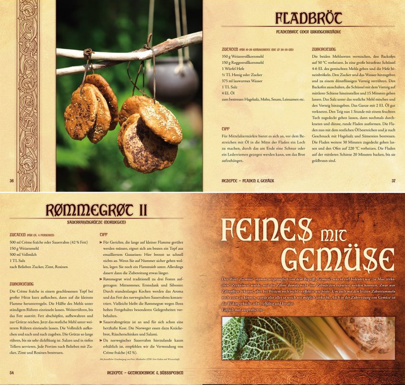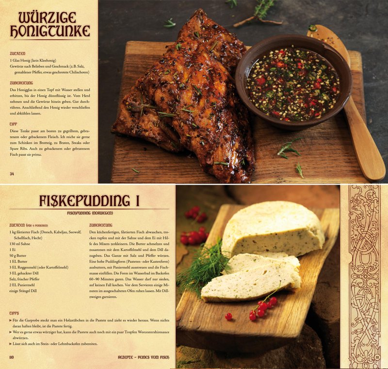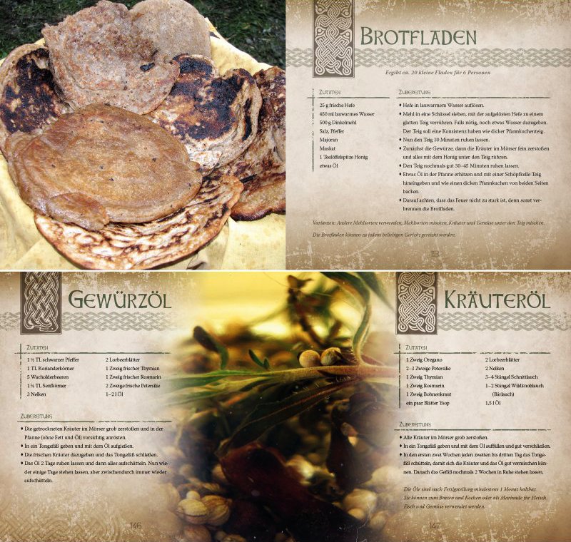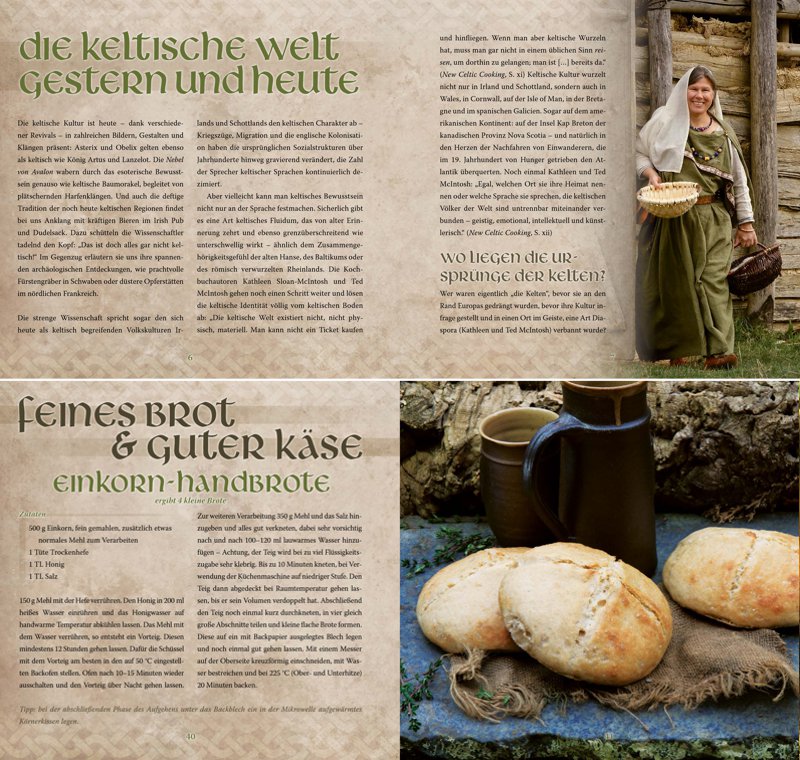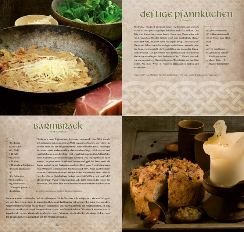 Das Kelten-Kochbuch zeigt sich im prachtvollen Gewand. Es erscheint als edles Hardcover im quadratischen Format und enthält professionelle Fotografien zu einem Großteil der Rezepte. Alle 136 Seiten sind vollfarbig und thematisch passend gestaltet, damit bereits beim Blättern der Funke des keltischen Lebensgefühls überspringt.