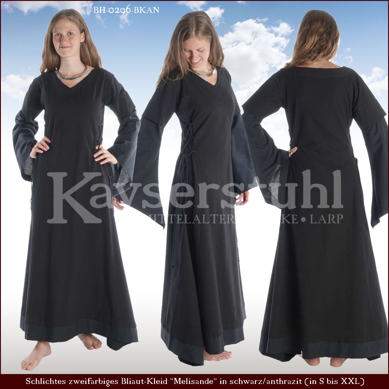 Dieses mittelalterlich inspirierte Bliautkleid hat weit geschnittene, am Oberarm und im Hüftbereich mit einer Zierborte versehene Trompetenärmel. Eine Schnürung am Rücken erleichtert die individuelle Einstellung der jeweiligen Passform.