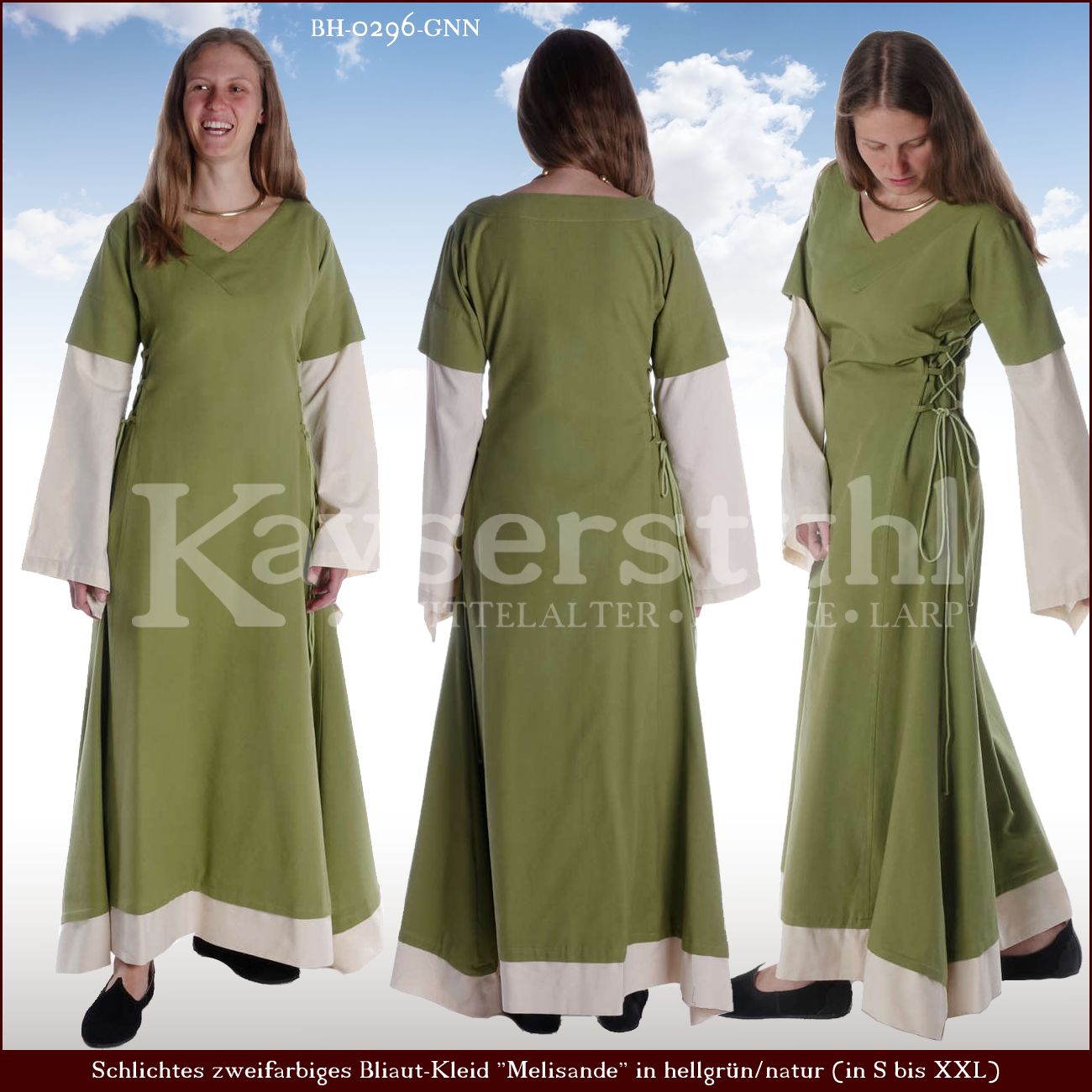 Dieses mittelalterlich inspirierte Bliautkleid hat weit geschnittene, am Oberarm geschnürte Trompetenärmel. Ein breites Band an der Taille sowie eine Schnürung am Rücken erleichtern die individuelle Einstellung des Tragekomforts.