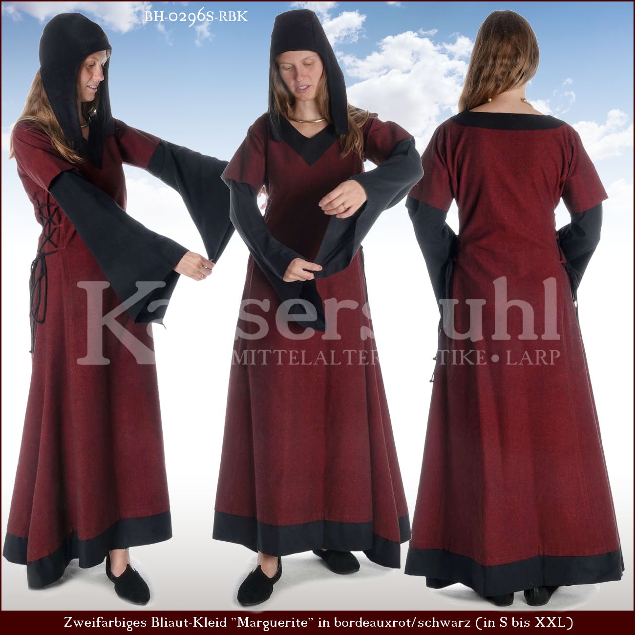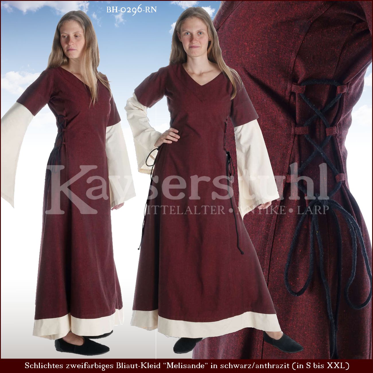 Bliaut-Kleid "Melanie" rot/natur mit Zierborte Aussehen und Schnitt dieses Kleides orientieren sich an der Mode des 12. Jahrhunderts. Zu dieser Zeit kam diese Form von Kleidern auf, man nennt sie Bliaut. Das Bliaut zeichnete sich besonders durch seitliche Schnürungen, ein ausgestelltes Rockteil und Trompetenärmel aus. Der hochwertige Stoff ist angenehm zu tragen und weder zu dick noch zu dünn. Das bodenlange am Saum weit geschnittene Kleid fällt sehr schön und ist in den Größen S, M, L, XL und XXL verfügbar. Seitlich ist das Kleid mit Schnürungen versehen, so lässt es sich individuell anpassen. Ärmel und Saum sind farblich abgesetzt und erzeugen so den Eindruck eines Unterkleides.