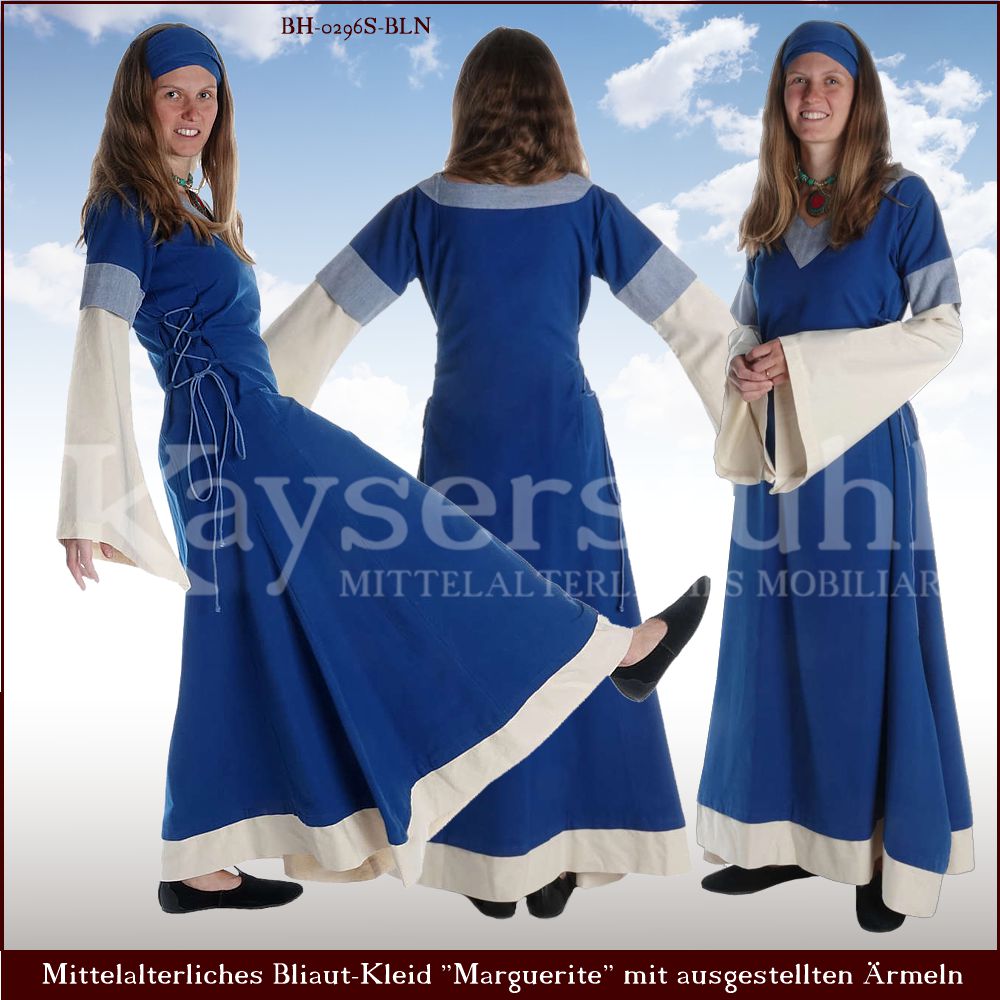 Ihr findet hier hochmittelalterlich orientierte Damen-Gewandungen in Form von Bliauts bzw. bliautartig inspirierten Kleidern, wie sie insbesondere im 12. Jahrhundert getragen wurden. Die Auswahl ist historisierend, aber teilweise grob belegorientiert. Wir haben hier ganz bewusst auf epochenübergreifende Kleidungsteile wie beispielsweise neutrale Cotten verzichtet. Diese Zusammenstellung richtet sich vorwiegend an Frauen. Schuhe, Gürtel, Taschen und Accessoires findet ihr an anderer Stelle auf unserer Seite.