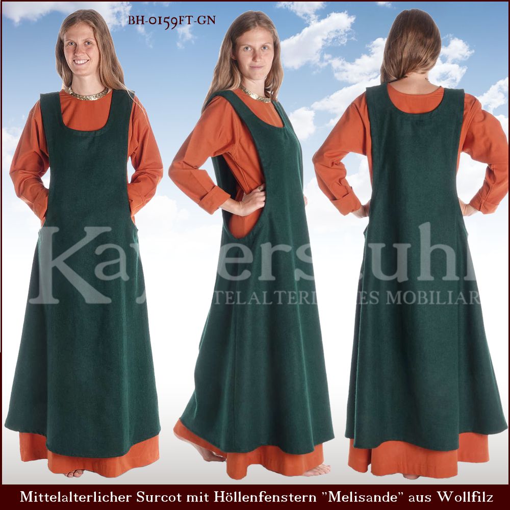 Dieser locker geschnittene, bodenlange Surcot ist aus festem Baumwollstoff (Canvas) gefertigt. Der feste Canvas-Stoff (Segeltuch) macht das Mittelalterkleid robust und schwer und somit für das Frühjahr und den Herbst besonders geeignet. Saum, Armlöcher und Ausschnitt sind mit einem feinen gewebten Baumwollstoff belegt. Die Armlöcher sind sehr großzügig geschnitten und enden auf Hüfthöhe. Ab der Hüfte sind seitlich sog. Geren (keilförmige Stoffstücke) eingesetzt, die dem Saum genügend Weite geben. Dieses Überkleid ist eine Rekonstruktion eines Surcots aus dem 14. Jh.