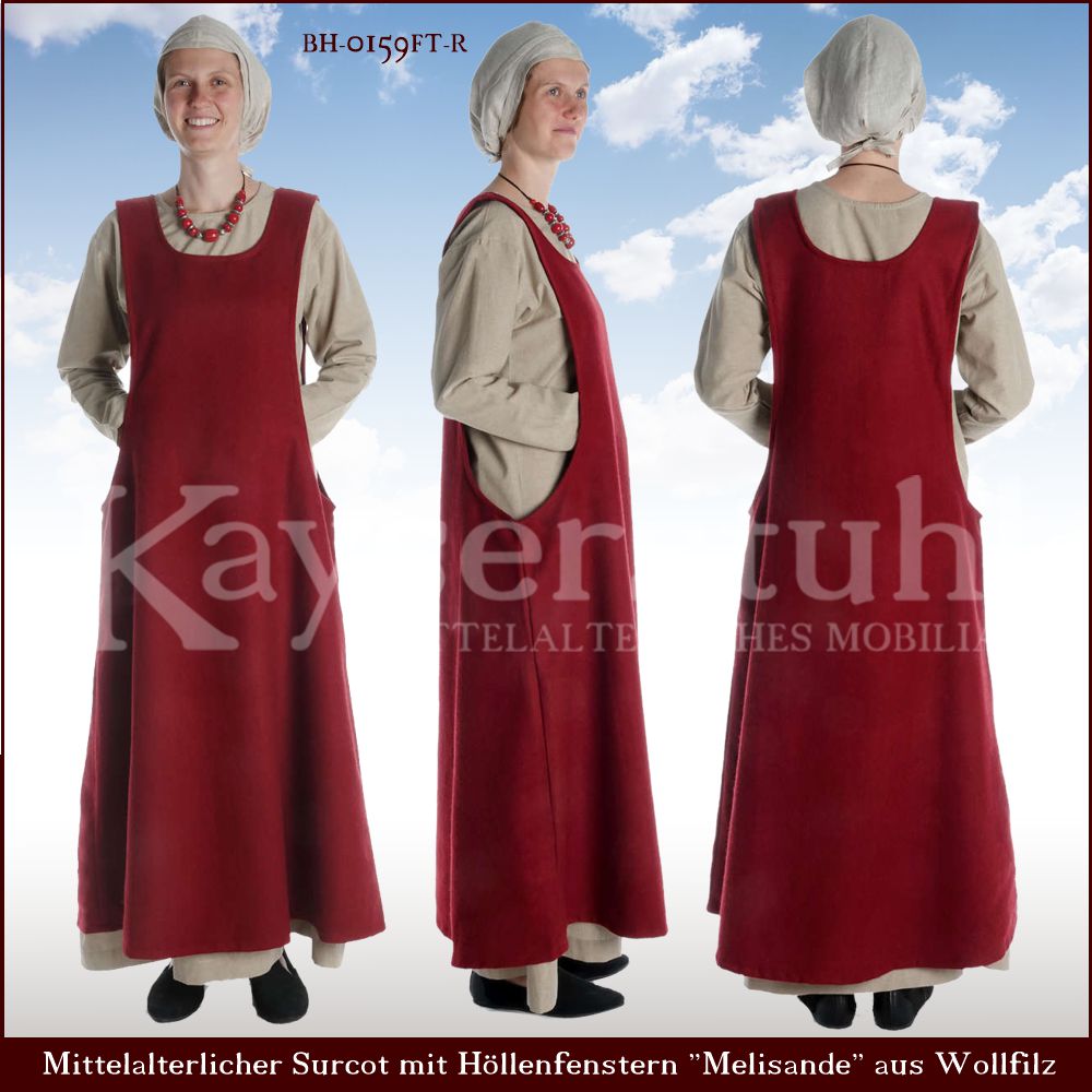 Als Teufelsfenster oder Höllenfenster wird ein weiter Ärmelausschnitt aus der Gotik bezeichnet, der bewirkte, dass vom Kleid im Ärmelbereich vorne und hinten teilweise nur noch ein handbreiter Streifen übrig blieb und der den Blick auf die seitlichen Schnürungen freigab. Er entwickelte sich etwa zwischen 1320 und 1345 und war besonders beim Surcot beliebt. Der weiche aber robuste Baumwollstoff dieses Kleides ist im Fischgrätmuster gewebt und am Halsausschnitt und vorn mit einer gewebten Borte, sowie am Saum mit einer breiten Juteborte verziert. Diese Art von Surcot wird logischerweise über einem Unterkleid getragen, da es an den Seiten bis zur Hüfte offen ist. Das abgebildete Unterkleid findet ihr hier, aber ihr könnt natürlich auch ein anderes verwenden.