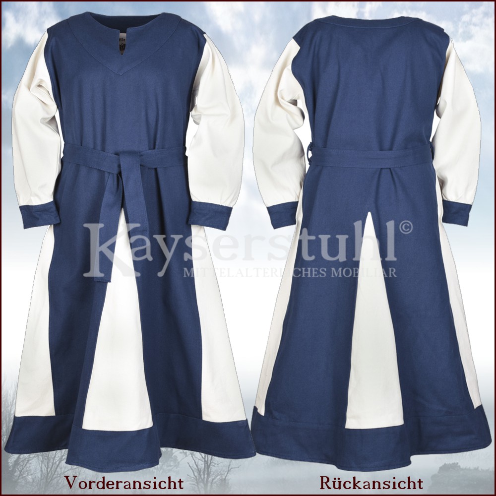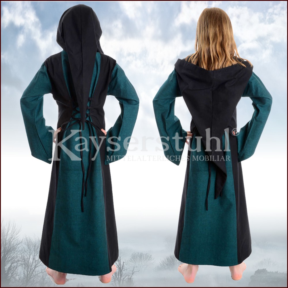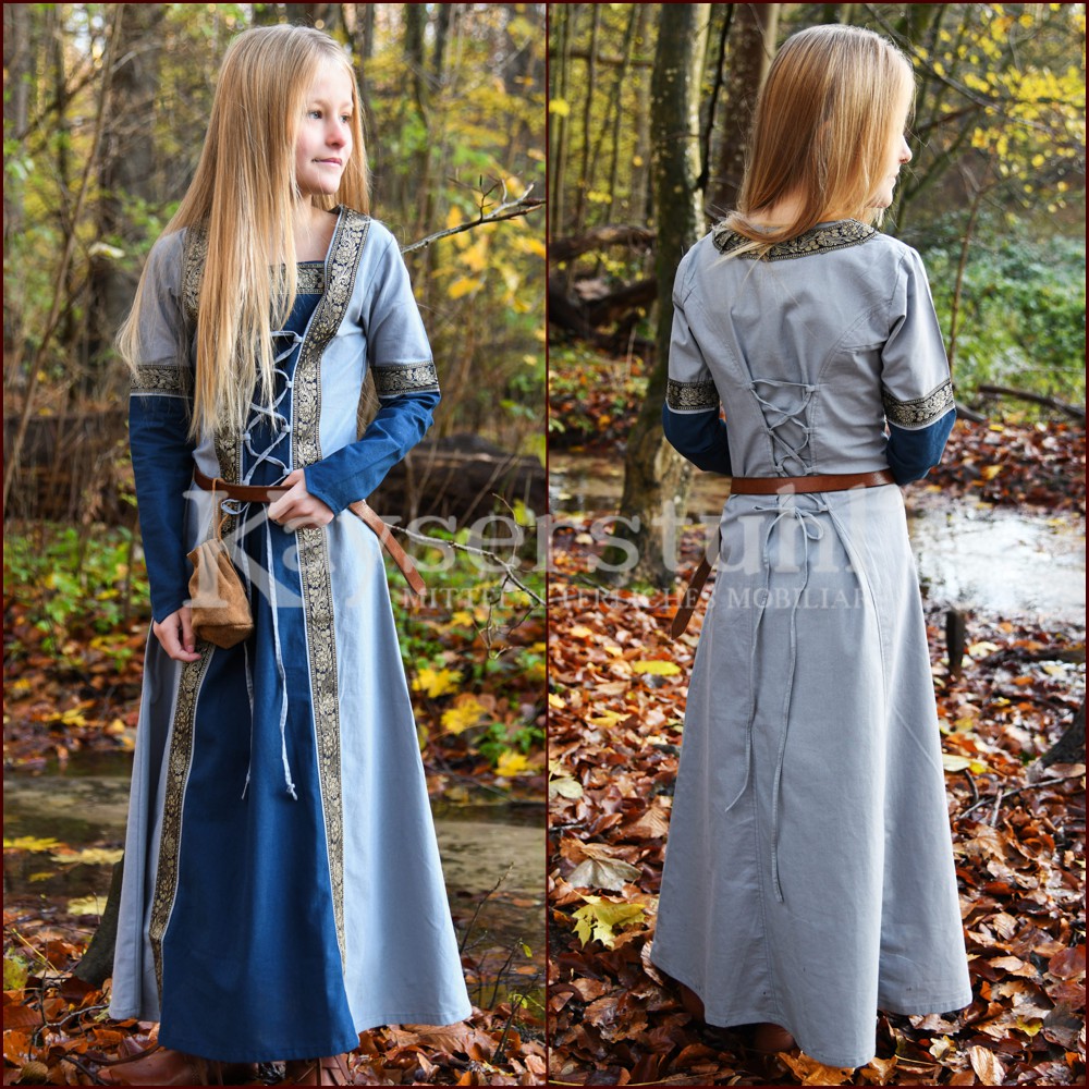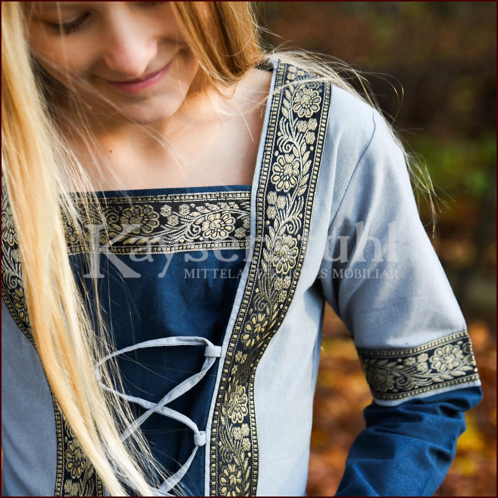 Sehr hübsches mittelalterlich historisierendes Kleid für größere und kleinere Mädchen. Das elegante Mittelalterkleid besteht aus zwei unterschiedlich gefärbten Lagen und ist aus 100% Baumwolle gefertigt. Es ist eng geschnitten und wird an der Vorder- und Rückseite zusätzlich geschnürt. Die goldene Bordüre und die enganliegenden Ärmel, die auf dem Handrücken spitz zulaufen, machen dieses Kleid einem echten Eyecatcher.