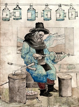 Bild rechts: Mann und Frau, die Kienspäne mit dem Mund halten, weil sie die Hände zum Arbeiten brauchen (16. Jahrhundert) |