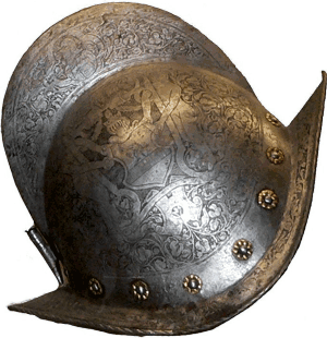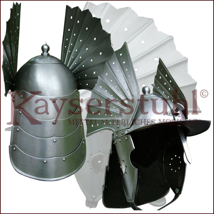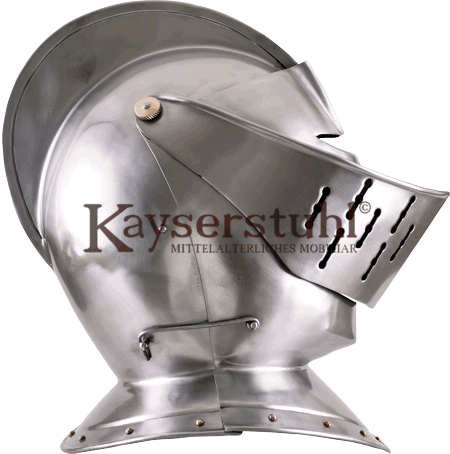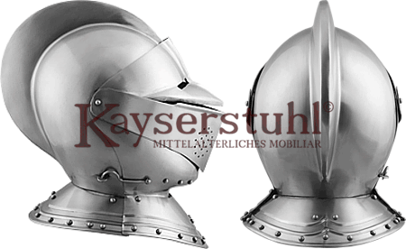 Wir führen Helme aus dem 16. und 17. Jahrhundert. Anfang des 16. Jahrhunderts entstanden komplett geschlossene Helme, bei denen Visier und Kinnschutz an derselben Stelle seitlich am Helm fixiert waren. Derartige geschlossene Helme wurden schnell zum wichtigsten Kopfschutz der schweren Reiterei und existierten in mehreren Varianten.