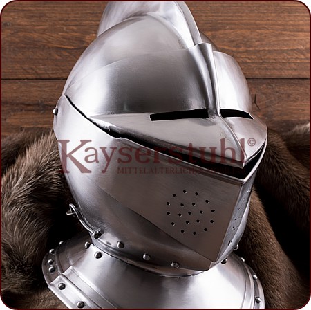 Die Scharniere für das Visier und die Seitenplatten sind für einen besseren Zugang außen angebracht. Das Visier der gefluteten Kalotte findet seine Vorbilder in den späten Blasebalg-Schallern. Der Helm selbst ist aber in der Grundkostruktion eine geschlossene Konstruktion, wie sie für die späten Turnierhelme typisch ist.