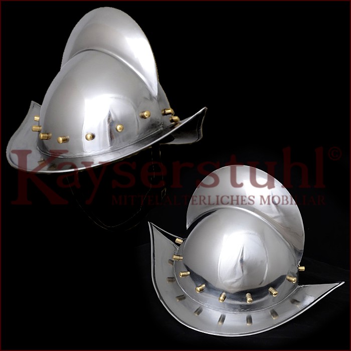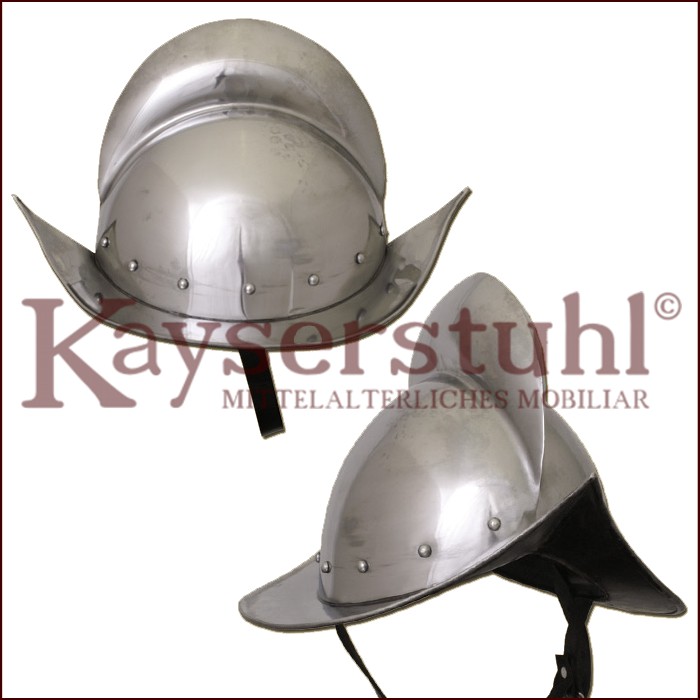 Die Form dieses robusten und eleganten kammlosen Cabasset- bzw. Morion-Helmes mit einem absolut realistisch wirkendem Antik-Finish in gehämmerter Optik hat eine Form, die bis ins Spanien des 16. und 17. Jahrhunderts zurückreicht. Er ist mit segmentierten Wangenplatten ausgestattet. Der Morion/Cabasset hat ein höhenverstellbares Lederinlet und einen Kinnriemen. Das Lederinlet ist kurz oberhalb der Krempe mit Stahlnieten befestigt.