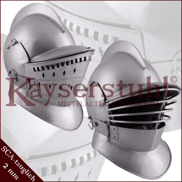 Diesen Helm gab es auch als Variante mit nach unten aufklappbarem Visier. Der geschlossene Helm wurde bis in das 17. Jahrhundert hinein verwendet, da er den besten Schutz bot. Helme, die eine uneingeschränkte Sicht garantierten, wurden allerdings immer gebräuchlicher.