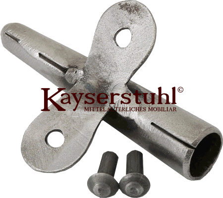 Dieser handgeschmiedete Helmzierhalter besteht aus einer Hülse zum Beispiel zur Aufnahme einer oder mehrerer Federn oder auch anderem Zierrat. Die Hülse ist mit einem Flansch verschweißt, der mittels beiliegender Nieten oder auch Schrauben (kundenseitig) an der Helmkalotte befestigt werden kann.