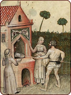 Bild oben: Frauen bei der Herstellung von Nudeln, Abbildung aus dem Tacuinum Sanitas, spätes 14. Jahrhundert