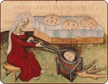 Bild oben: Eine Frau backt Waffeln, spätes 14. Jahrhundert Halen/Kesselsägen