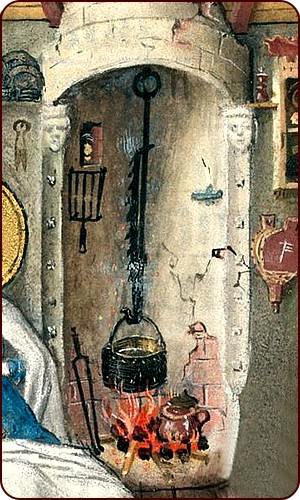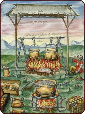 Küchenutensilien wie Dreifußtöpfe, Pfannen, Waffeleisen, Siebe und Reiben waren ebenso wie Bratenroste und drehbare Bratenspieße wegen ihrer hohen Anschaffungskosten gewöhnlich nur in wohlhabenden Haushalten zu finden.[49] Bratenspieße gab es in verschiedenen Größen und unterschiedlichen Materialien, um von der Wachtel bis zum Ochsen alles am offenen Feuer garen zu können. Töpfe und Kessel wurden meist mit Hilfe von schwenkbaren Hebevorrichtungen über dem Feuer platziert und hingen an längenverstellbaren Ketten, um die Hitzeintensität regulieren zu können. Viele Haushalte besaßen einen Mörser, da eine große Anzahl mittelalterlicher Rezepte Zutaten verlangte, die fein zerrieben oder musartig sein mussten. |