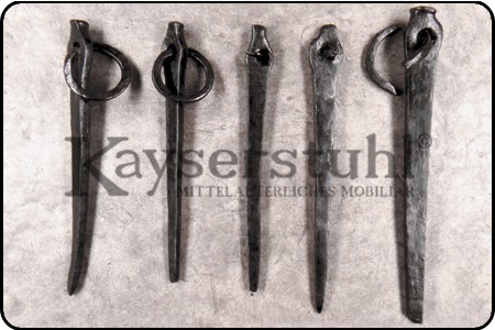 Von Hand geschmiedeten Mittelalter-Zeltnagel kaufen, der mit einer hübschen Tordierung und einer großen Öse für die Zeltleine gefertigt wurde. Das Ende des Mittelalter-Zeltnagels ist in Form einer offenen Öse ausgeschmiedet, so dass sich die Zeltleine einfach daran befestigen lässt und sicher sitzt.