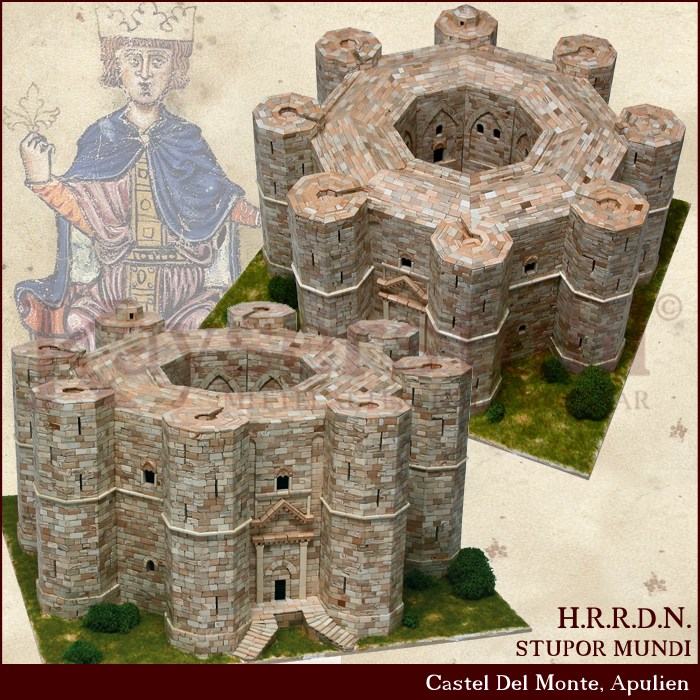 Das Castel del Monte (vorher "castrum Sancta Maria de Monte") ist ein Bauwerk aus der Zeit des Stauferkaisers Friedrich II. in Apulien im Südosten Italiens. Das Schloss wurde von 1240 bis um 1250 errichtet, wahrscheinlich aber nie ganz vollendet. Insbesondere der Innenausbau ist anscheinend nicht beendet worden. Über die Funktion der Burganlage ist gerätselt worden, wobei die achteckige Grundrissfigur phantastische Gedanken beflügelte. Die eher sachlichen Deutungen reichen von einem Jagdschloss bis hin zu einem Gebäude zur Aufbewahrung des Staatsschatzes. Angeblich soll Friedrich II. selbst an der Planung beteiligt gewesen sein. Das Bauwerk ist voller Symbolismen. Castel del Monte erinnert beispielsweise an eine Krone, es könnte als Abbild der Reichskrone gedacht gewesen sein, die ebenfalls oktogonal ist. Acht Ecken hat auch die Pfalzkapelle in Aachen, wo Friedrich zum römisch-deutschen König gekrönt worden war, acht Ecken hat der Barbarossaleuchter in dieser Kapelle, auch die Barbarossapfalz von Hagenau, sein Lieblingsaufenthalt in Deutschland, die selbst eine Nachbildung der Pfalzkapelle Aachen ist.