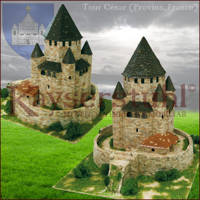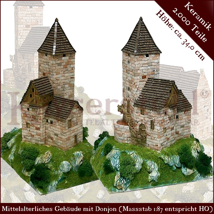 Dieser Bausatz für ein mittelalterliches Gebäude mit Donjon und Treppe ist im Modelleisenbahner-freundlichen Maßstab H0, also ca. 1:87, gefertigt.