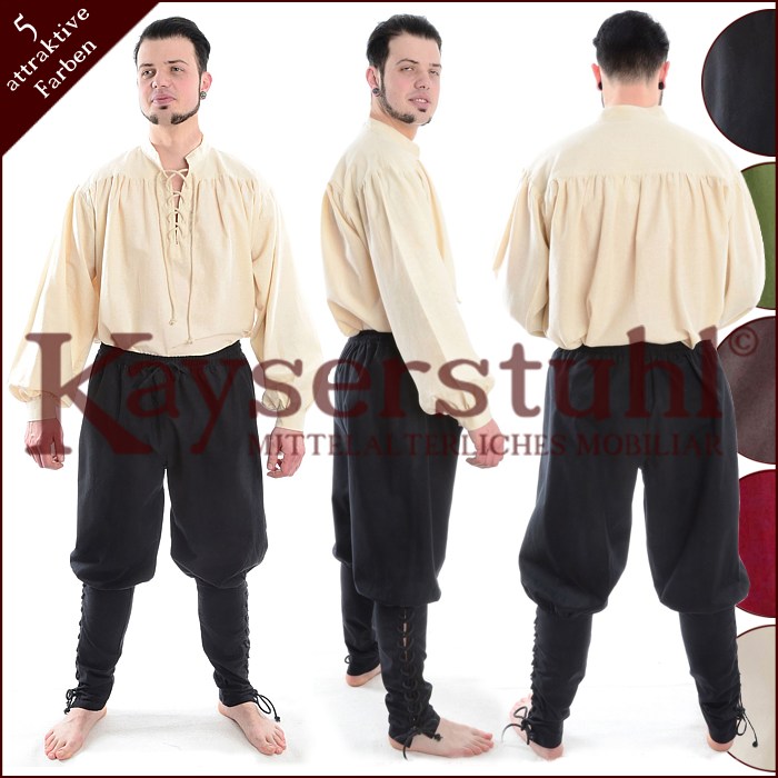 Um Mißverständnissen vorzubeugen, wollen wir an dieser Stelle darauf hinweisen, dass der Ausdruck "mittelalterlich" nicht den Umstand einer exakten Replik eines Gegenstandes aus dem Mittelalter beschreibt, sondern als Synonym für eine Form-gebung zu sehen ist, die Mermale mittelalterlicher Kleidung aufweist. So ersetzt bei den "zeitnahen Interpretationen" oft die preiswertere Baumwolle oder robuster Canvas das Leinen bzw. die Wolle.