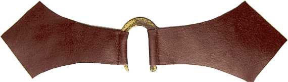 Hufeisenförmige Fibel mit zwei Leder-Applikationen zur Anbringung an Umhängen etcetera. Auch einzelne Drachenkopf-Fibeln sind erhältlich.