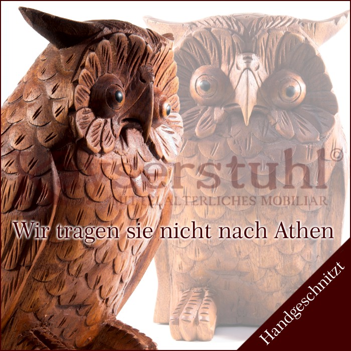 Dieses zauberhafte und - um es mit Grzimek zu halten - putzige Tierchen gibt es in drei originellen Varianten. Die Eulen sind handgeschnitzt und erfreuen nicht nur Philosophenherzen. Die Eule gilt in der westlichen Welt auch als Vogel der Weisheit; als solcher ist der Steinkauz das Begleittier der Göttin Athene. Wir tragen sie trotzdem nicht nach Athen.