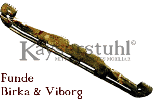 Bild oben: Aus Haithabu wurden 4 solcher Taschenbügel für wikingerzeitliche Schultertaschen von 18 bis 49 cm Länge in verschiedenen Formen gefunden. Es sind aber auch von anderen Orten Taschenbügel aus der Wikingerzeit belegt, so im schwedischen Birka und dänischen Viborg.