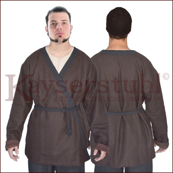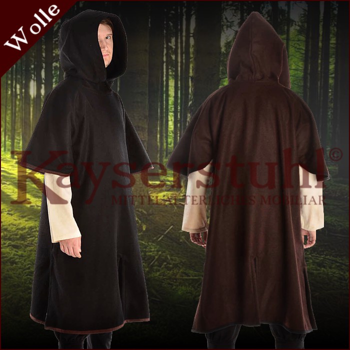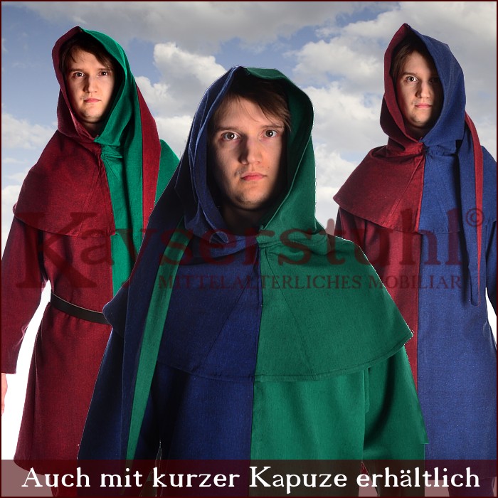 Hochwertige Gugel mit langer Kapuze, einer in der Regel vertikal halbgeteilten mittelalterlichen Mode, die sich vom 11. bis zum 15. Jahrhundert in ganz Europa verbreitete, im 16. Jahrhundert jedoch wieder verschwand und sich danach nur noch bei der Zunft der Narren und Gaukler hielt. In den Jahrhunderten davor war das aber noch allgemein übliche Kleidung. Diese Gugeln gibt es übrigens auch in einer Variante mit kurzer Kapuze.