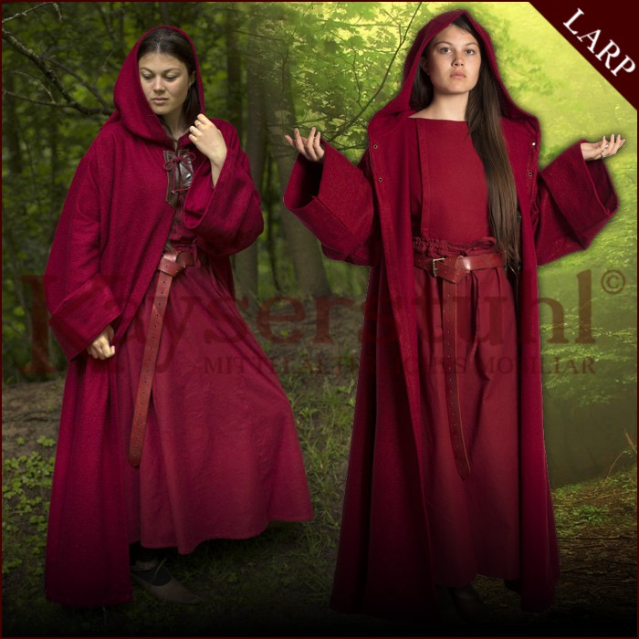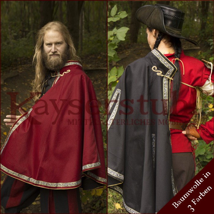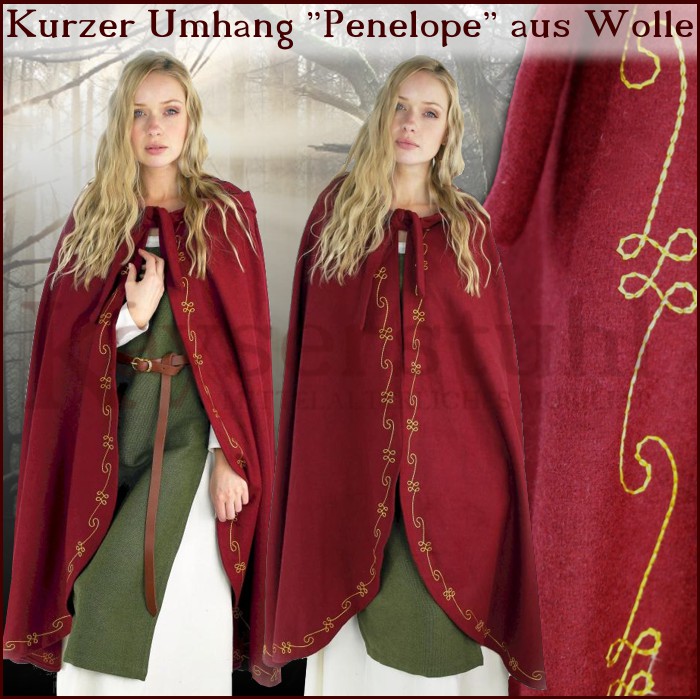 aus roter Wolle mit Bordüre zum Binden mit extraweiter Kapuze (auch in schwarz, braun oder grün)