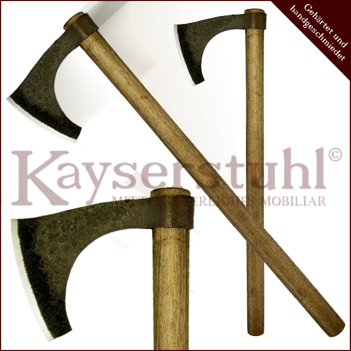 Mittelalterliche Bogenschützenaxt mit Axtblatt aus gehärtetem Stahl, der Schaft aus Hartholz. Solche Äxte wurden sowohl als Werkzeug als auch als Waffe eingesetzt und waren eine klassische Zweitwaffe. Mit der hammerartigen Rückseite konnte man Pfähle für Blockaden einschlagen, und sie dann mit der Klinge schärfen. Achtung: Lieferung leider nur ohne abgebildeten Schaft
