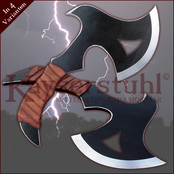Ausserdem könnt ihr selbst entscheiden, ob ihr die Streitaxt mit schaukampftauglicher 3 mm breiter Schlagkante oder mit schleifbarer Grundschärfe* von ca. 0,5 - 1 mm haben wollt. Bei diesem Artikel kann es durch die Fertigungsoptionen zu Lieferzeiten von ca. 4 - 6 Wochen kommen (*Aufpreis).