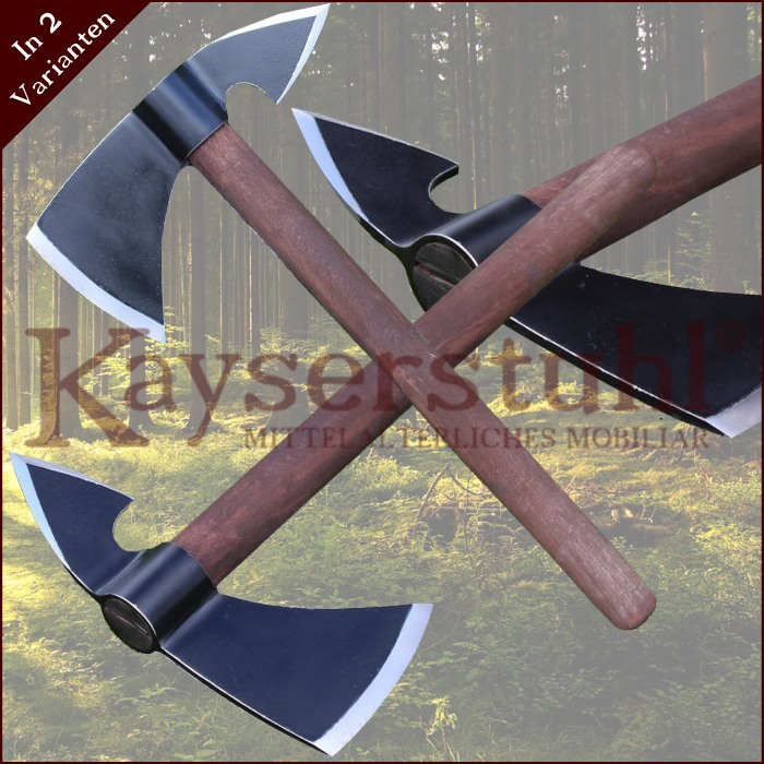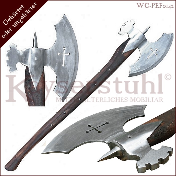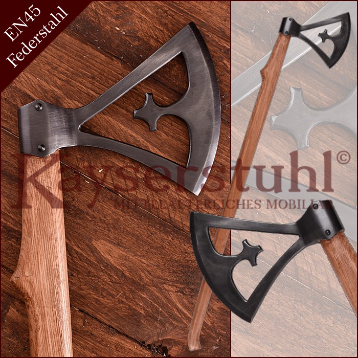 Wunderschöne, geschmiedete Streitaxt die je nach persönlichem Stil und Kraftreserven ein- oder zweihändig geführt werden kann. Das Axtblatt ist mit einem Kreuz durchbrochen. Dieses Prachtstück gibt es wahlweise aus UST37-2 Konstruktionsstahl oder aus gehärtetem Federstahl 54SiCr6.