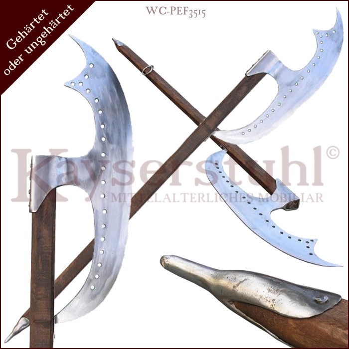 Streitaxt Diese elegante spätmittelalterliche Streitaxt hat eine durchbrochene Klinge aus gehärtetem