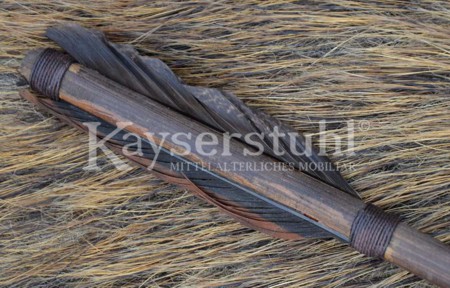 Handgemachter mittelalterlicher Armbrustpfeil bzw. Armbrustbolzen mit handgeschmiedeter Jagdspitze und Leder-Befiederung.