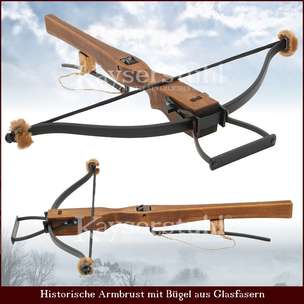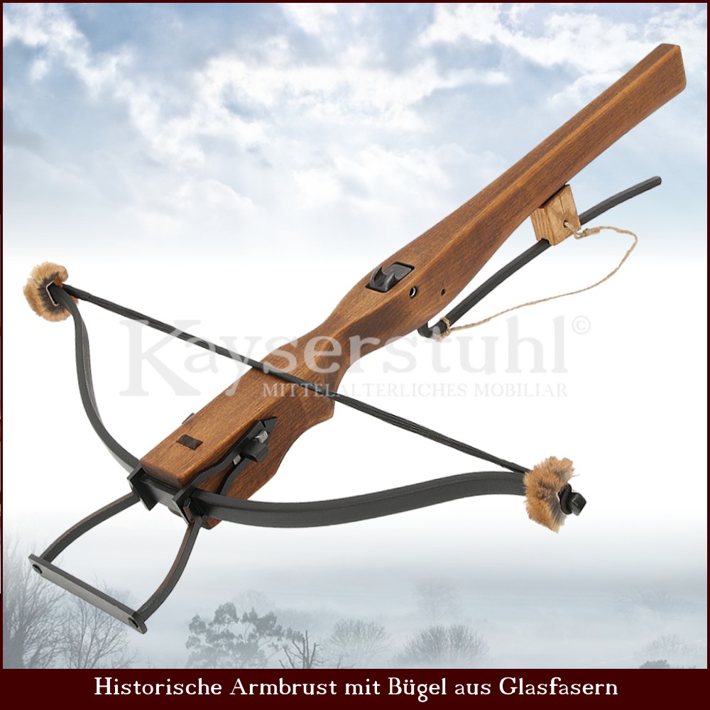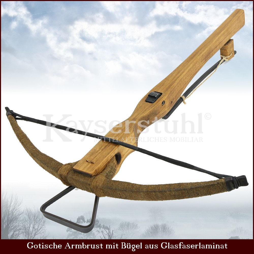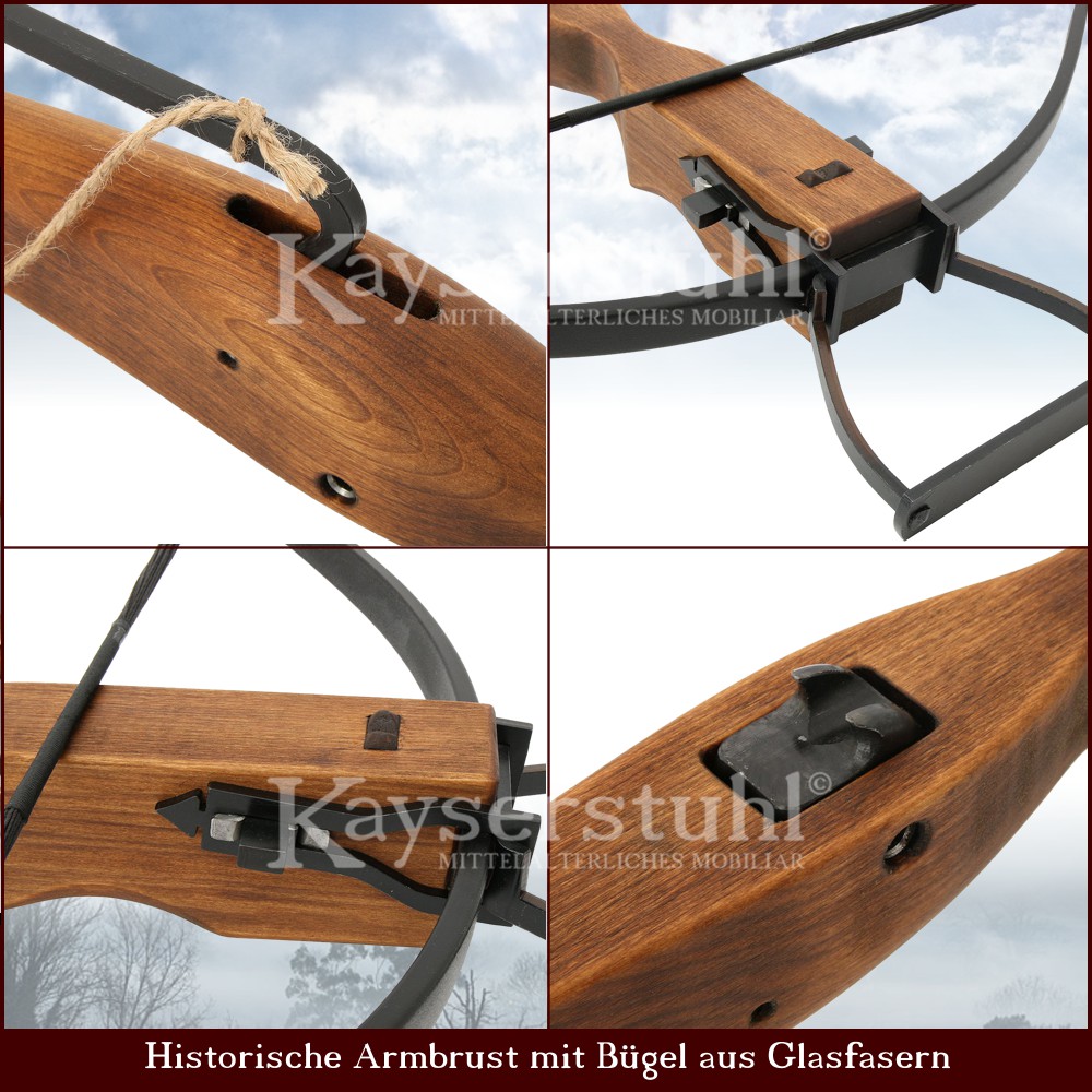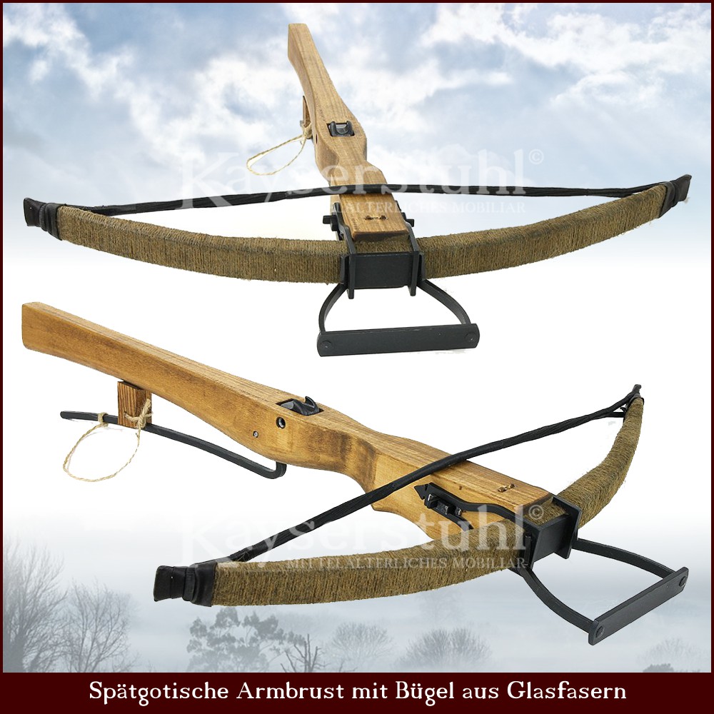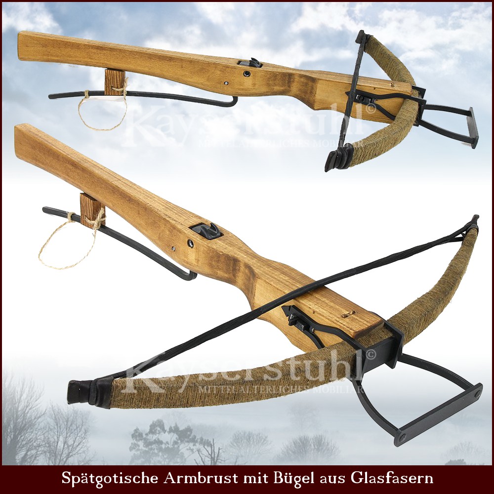 Voll funktionsfähige Armbrust im spätgotischen Stil. Der Bogen besteht aus Glasfaser-Laminat und weist eine Hanf-Wicklung auf. Der Schaft besteht aus Eiche und ist handgefertigt. Die Farbe kann abweichen. Die Dacronsehne ist relativ exakt auf die jeweilige Zugfestigkeit abgestimmt. Der Fußbügel dient als Spannhilfe, wobei das bei 244 lbs schon Geschick und Handwerk erfordert. Deswegen gibt es diese sehr authentische und schöne Armbrust auch in minderen Zugstärken.