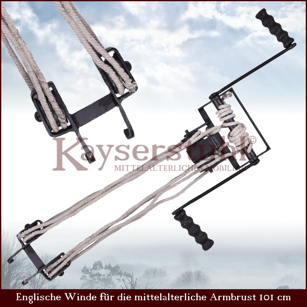 Die sogenannte englische Winde ist eine Art Flaschenzug, der auf die Säule der Armbrust aufgesteckt wird. Die Sehne wird in die doppelten Spannhaken am oberen Radgehäuse eingelegt und durch beidhändiges Drehen der beiden auf einer Welle sitzenden Kurbeln über Seile gespannt. Diese Winde passt perfekt zur Armbrust des 14. Jahrhunderts (WS-0616510400), kann aber bedingt auch für andere Armbrüste eingesetzt werden.